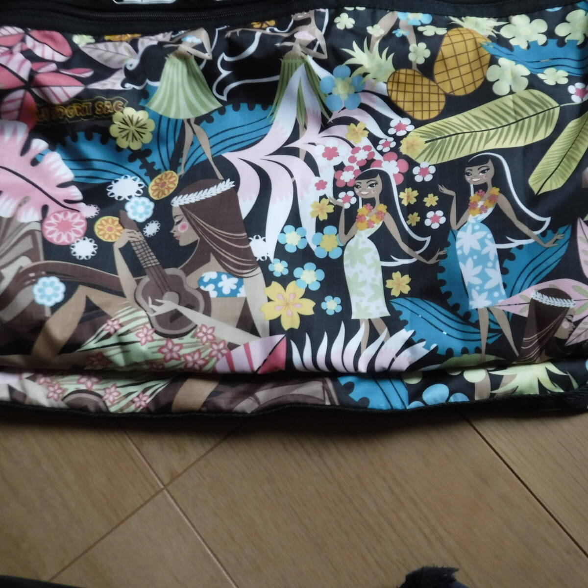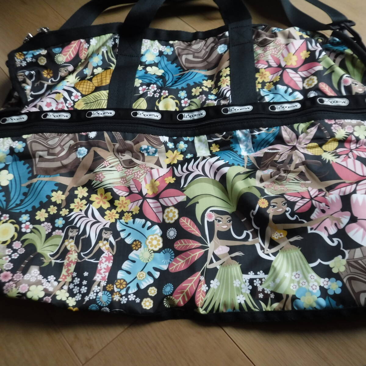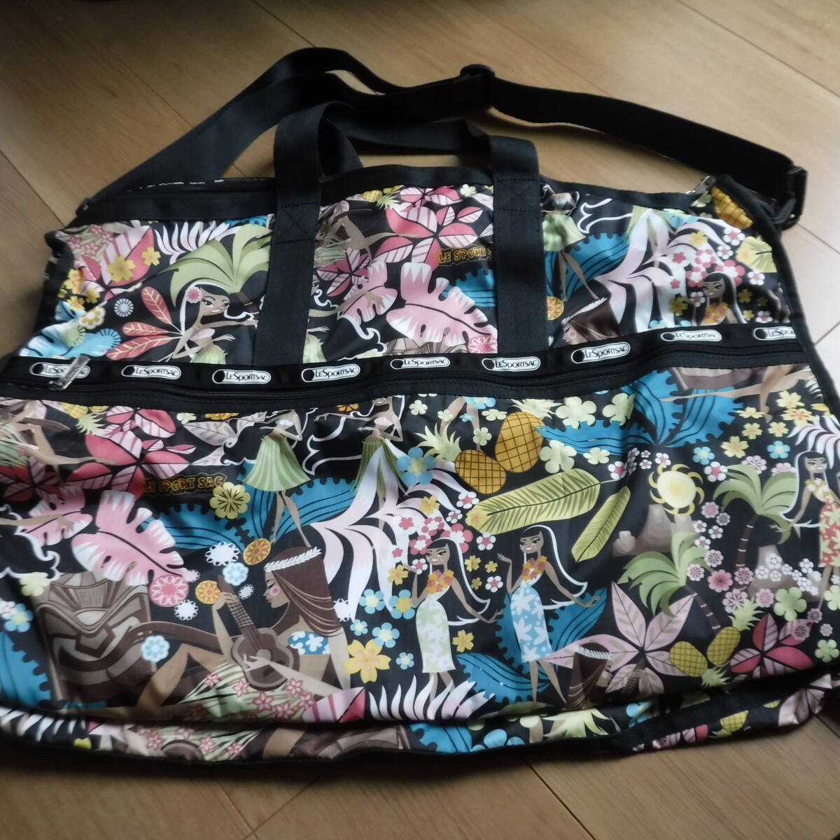 レスポートサックのハワイ限定ワヒネフラのボストンバッグで、サイズは個人寸法で横60縦43マチ24センチ位、トップは両側から開くチャック式(鍵あり)、取り外し&長さ調節可能なショルダーベルトが付いているので、手で持ったり肩から掛けたり斜め掛けにもできると思います☆内側も黒なので汚れが目立ちにくく、4面全てにチャック式大きめポケットがあり便利♪かなり大きめなので、1週間くらいの旅行なら行けるかもしれません。。ワヒネフラ柄は数年前にハワイのレスポートサックで販売されており、黒地にフラガールやワヒネ、ヤシの木やプルメリア、ダイアモンドヘッドなどハワイ感たっぷりでとても可愛い柄ですが、今では製造販売されていないはずですので、この状態での入手は困難かと思います。未使用ですが、長期個人保管につき、多少の汚れや擦れ、金具のくすみや傷やシワなどある場合がありますので、ノークレームノーリターンでお願いします!レスポのボストンは結構なお値段がします。