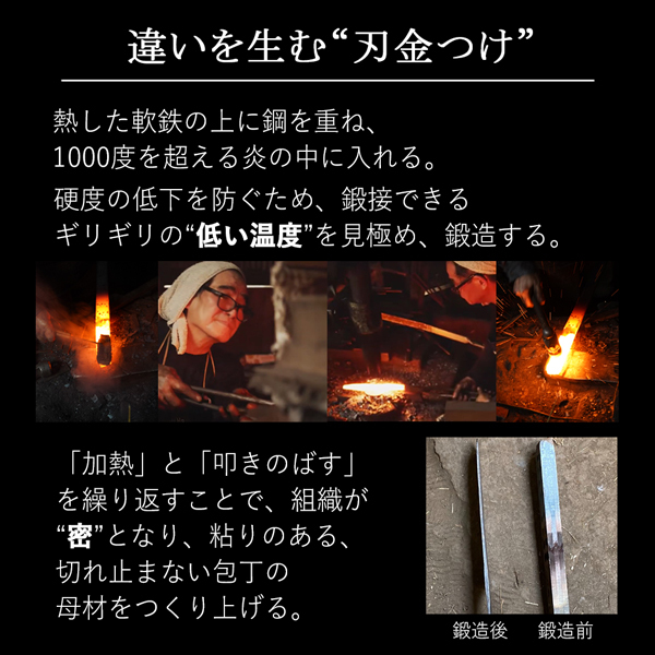 刃は、熟練の技で鋼をハンマーで叩き、精魂込めて火造りしています