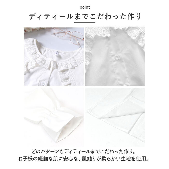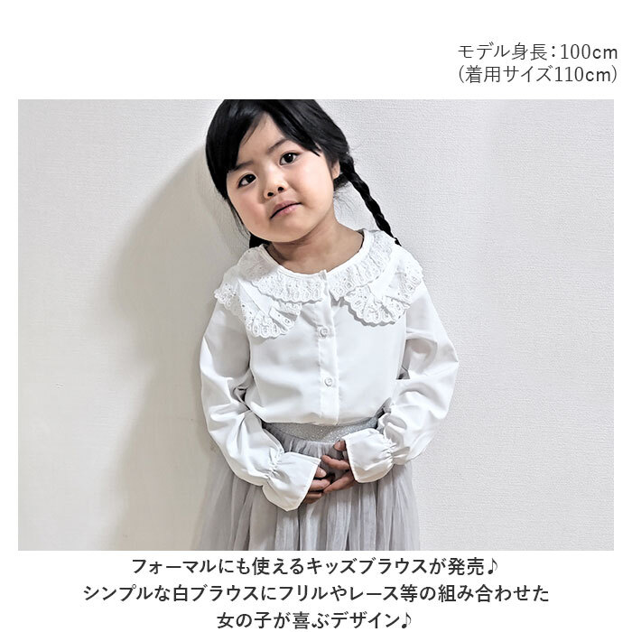商品説明 | ・・フォーマルにも使えるキッズブラウスが発売♪ ・シンプルな白ブラウスにフリルやレース等の組み合わせた女の子が喜ぶデザイン♪ ・計3パターンのラインナップ☆お気に入りのデザインがチョイス可能。 ・どのパターンもディティールまでこだわった作り。 ・お子様の繊細な肌に安心な、肌触りが柔らかい生地を使用。 ・普段使いにはもちろん華やかなフォーマルシーンや撮影にもピッタリなアイテム。 |