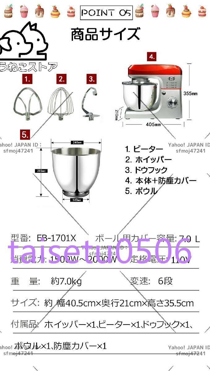 付属品:ホイッパー×1、ビーター×1、ドゥフック×1、ボウル×1、防塵カバー×1