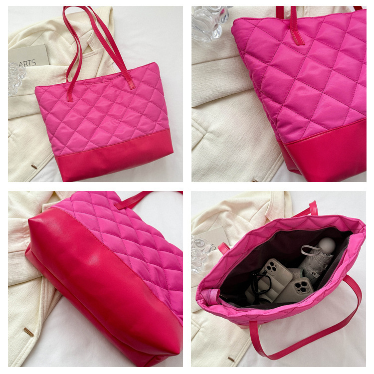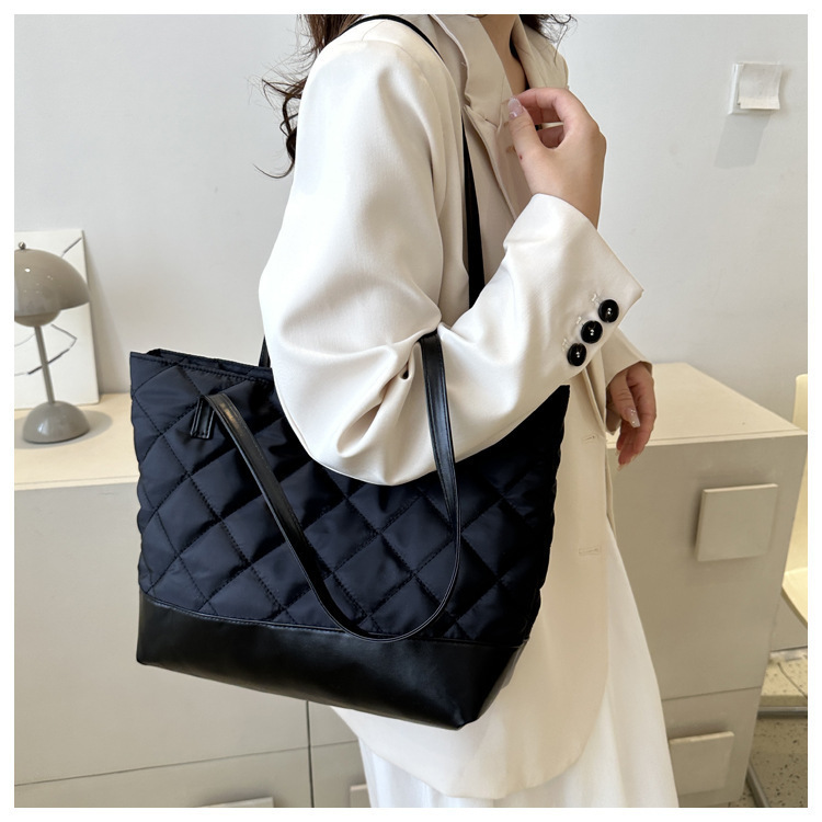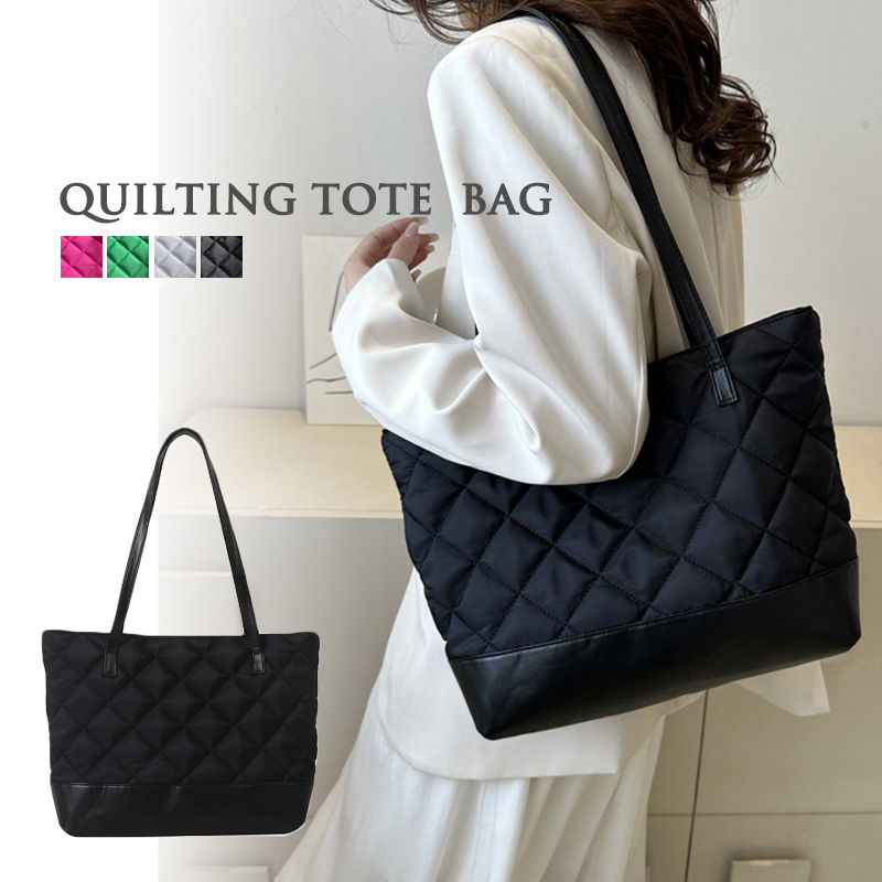 大人っぽい雰囲気のキルティングトートバッグファスナー仕様で中の物が落ちる心配がありませんマチがしっかりあり、嬉しい大容量サイズ170gととても軽量で肩への負担が少ないですデイリー使いにはもちろん、通勤、マザーズバッグ、旅行まで、色んなシーンでお使いいただけますカジュアルコーデからきれいめコーデまでスタイルを選ばず使えるバッグですサイズ(約):上幅40cm 下幅31cm 高さ27cm マチ11.5cm素材:ナイロンカラー:ブラック