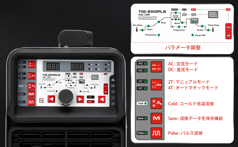 AC DC/Cold/ TIG/パルス/2T4T、複雑なボタン操作は一切なし。