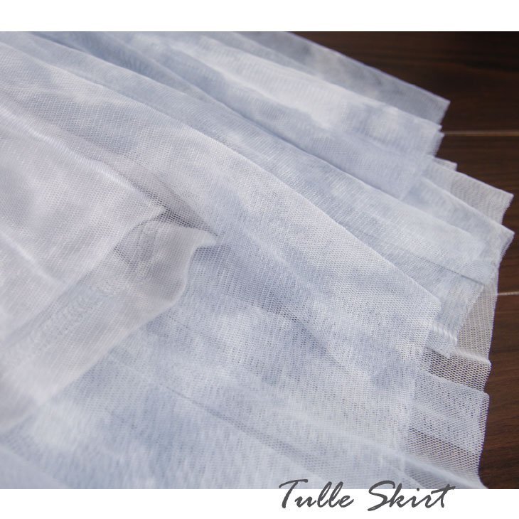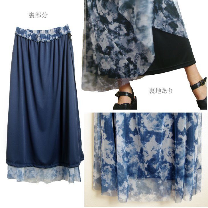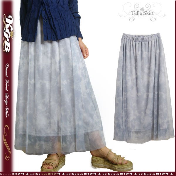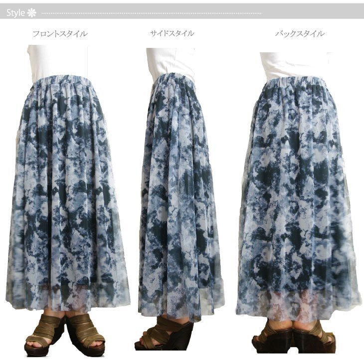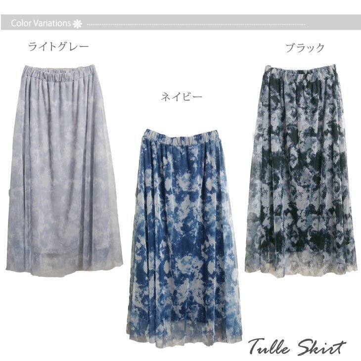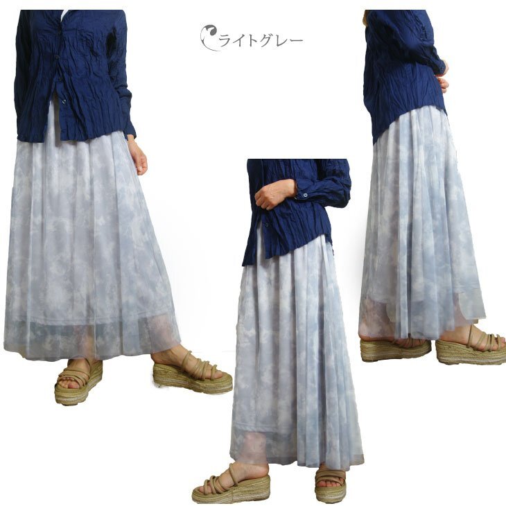 L ライトグレー スカート シアー レディース ロング丈 タイダイ柄 チュール ギャザースカート フレアー ウエストゴム 新品