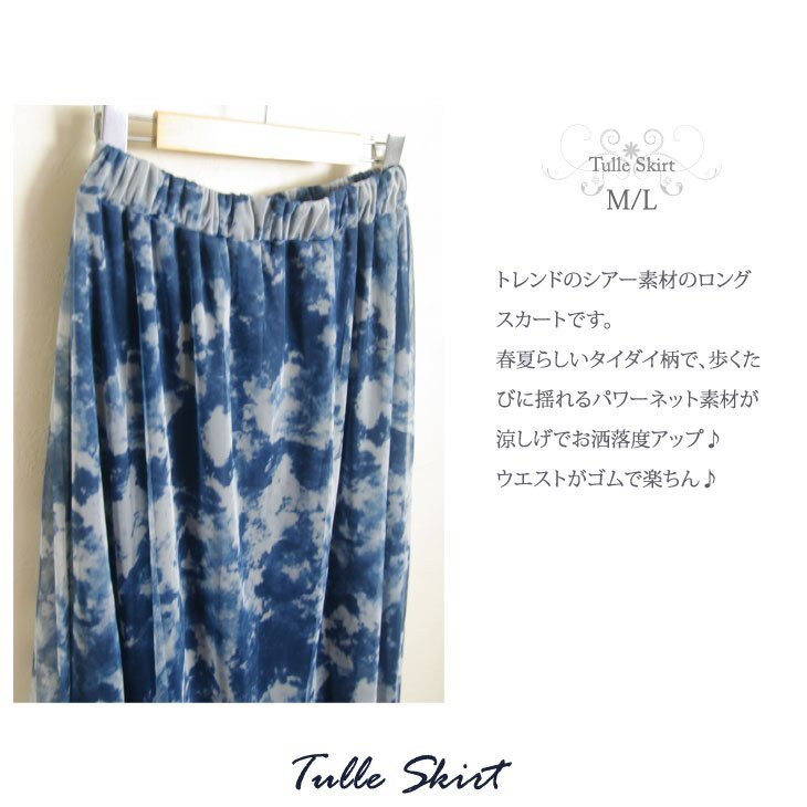 ★春夏の装いにぴったりなアイテムです。このスカートは、涼しげなシアー素材を使用しており、軽やかな着心地が魅力です。特に注目すべきは、タイダイ柄で、どんなトップスとも相性が良く、カジュアルからドレッシーなスタイルまで幅広く対応します。