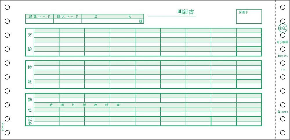 ドットプリンタ帳票。3枚複写。明細書/明細書/明細書。刷色:緑/青/青。サイズ:10_3/10x5"。ミシン目切り離し後の横サイズ:9_8/10"。2枚目と3枚目は密封式の封筒になっています。透けないように地紋入り。封緘シール付き。