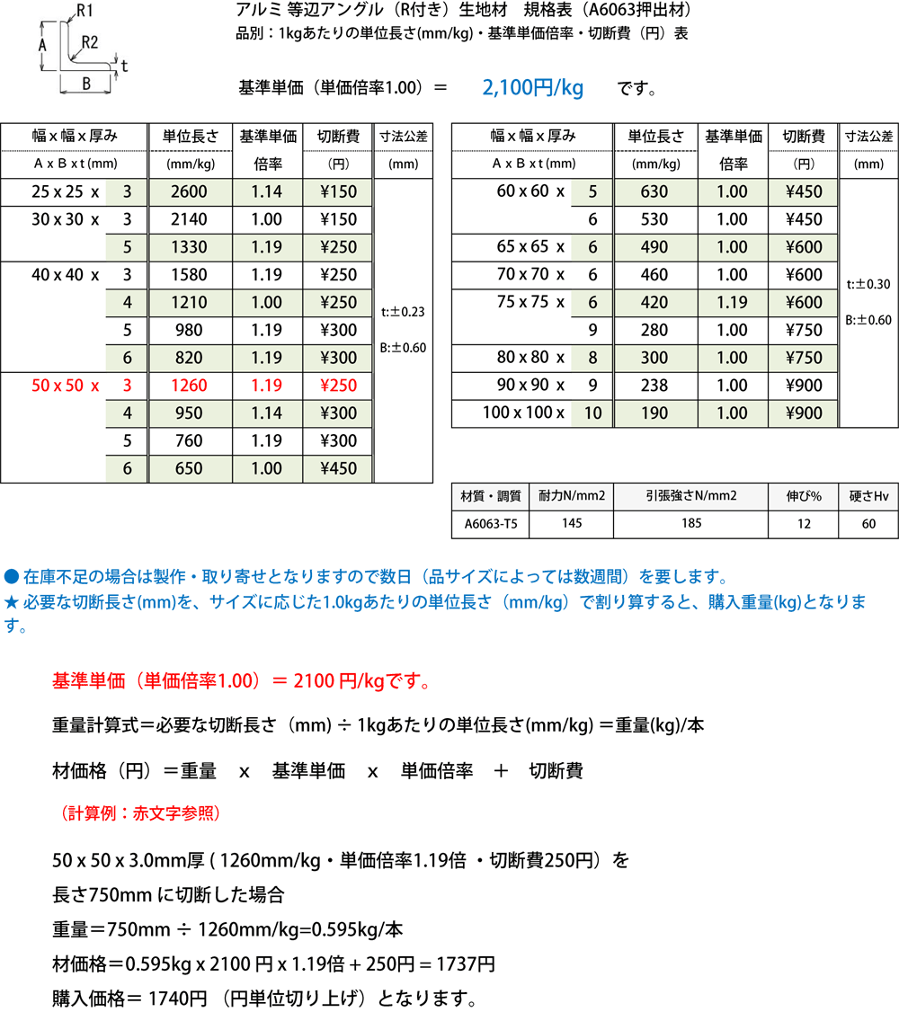 アルミ製等辺アングルL型R付き(材質6063)の生地材、各品サイズの