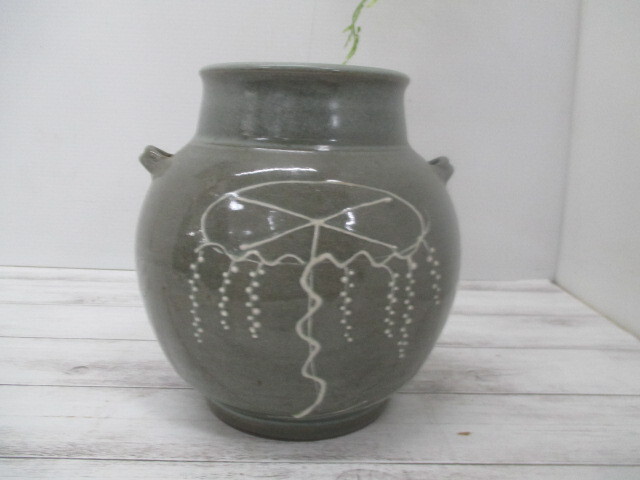 耳付き・陶器・グレー系・花瓶・飾り壺 和風のお部屋や玄関先などにいかがでしょうか サイズ(約) 直径 12㎝ 高さ 21.5㎝ 箱は有りません。現状売りとなります。 ★出品中の商品は、店頭でも販売しております。 店頭で売れた場合には期日に関わらずオークションを早期終了させていだきます (ご入札があった商品は直ちに店頭からお下げしておりますが、稀に入れ違いで売れてしまう場合もございます。ご了承くださいませ) 当社のオークションは返品・交換・キャンセル等は一切お断りさせて頂いております。充分ご検討の上ご入札下さいませ。 | |