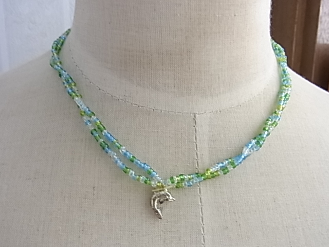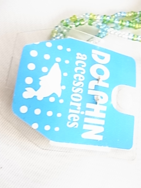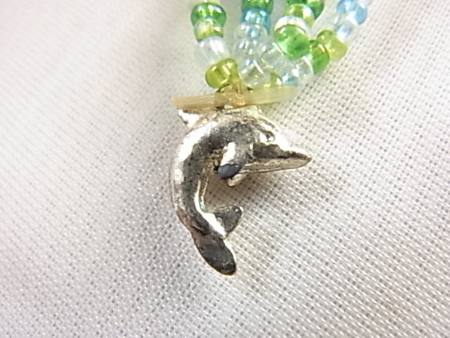 ◆新品未使用品 台紙付きシルバートーンのDOLPHINイルカのトップが可愛らしいデザイン 水色や緑色のビーズが涼し気2連 バンチペンダント