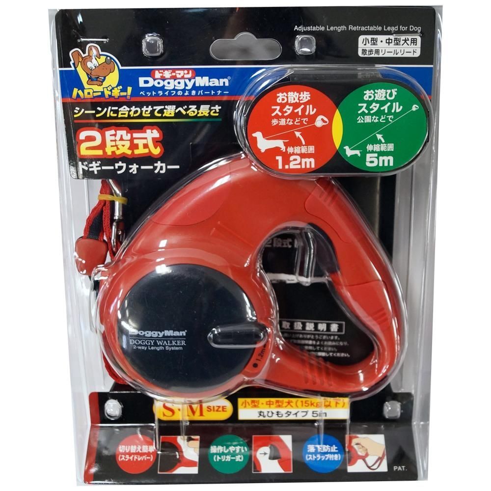 路上歩行は1.2m、広場で自由に5m、伸びる長さを2種類に固定できる伸縮リールリード。・本体側面にある切り替えレバーでフリーの長さを1.2m、5mにセットできるリール式伸縮リード。・トリガーボタン一つでロック&フリーができる簡単操作。・体重25kg以下の中型犬用。・丸紐タイプ。落下防止ストラップつき。・本体側面の表示に合わせてレバーをスライドさせるだけでリードが伸縮する範囲を1.2m、5mから選べる使いやすい伸縮リード。