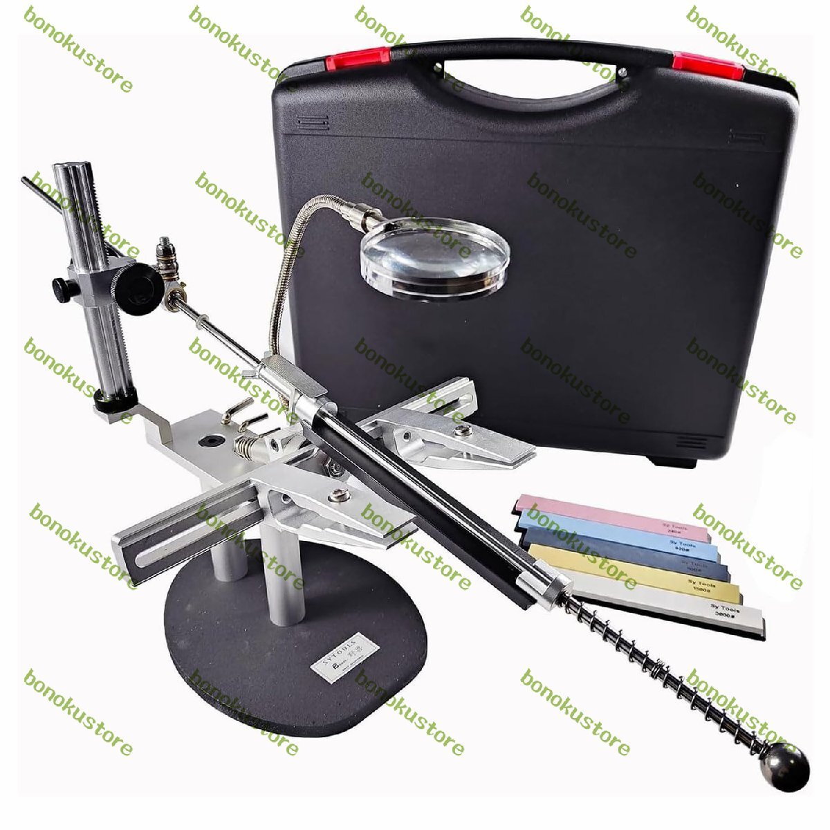 名前: プロのナイフ研ぎ器 砥石:240#/600#/800#/1500#/3000# 材質:アルミニウム合金表面+ステンレス鋼 角度範囲: 9°-30° 角度増加: 0.1° 推奨ナイフの厚さ: 推奨ナイフの長さ: 寸法: 55x32cm/21x12インチ パック: 1x ナイフ研ぎ器 砥石×5