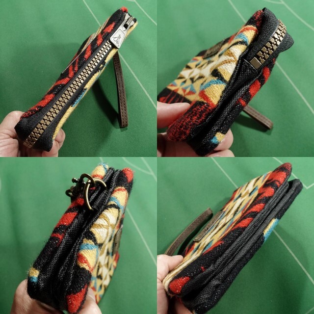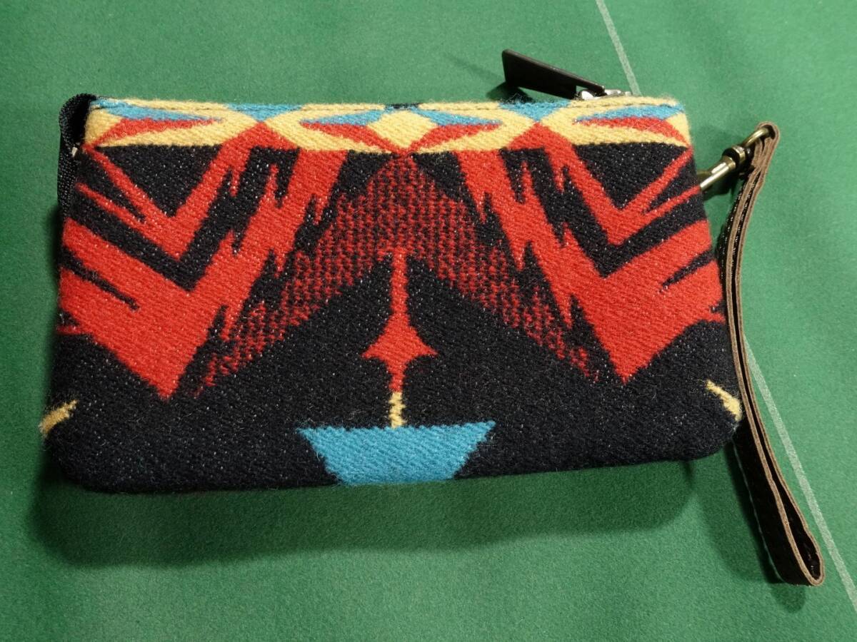 ▲PENDLETON ウール/コットン+ナイロン素材 ハンドストラップ付 ジップポーチ ウォレット 寝ブラックベースネイティブ柄 中古・美品です。