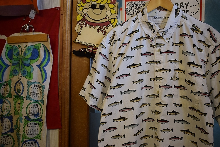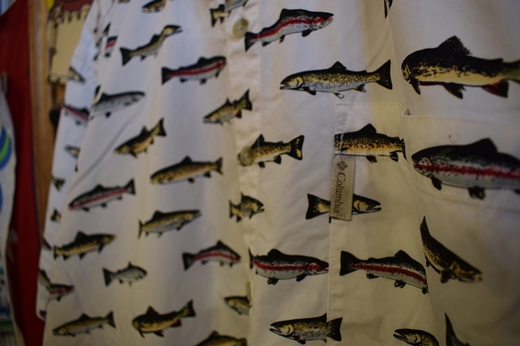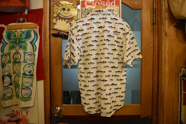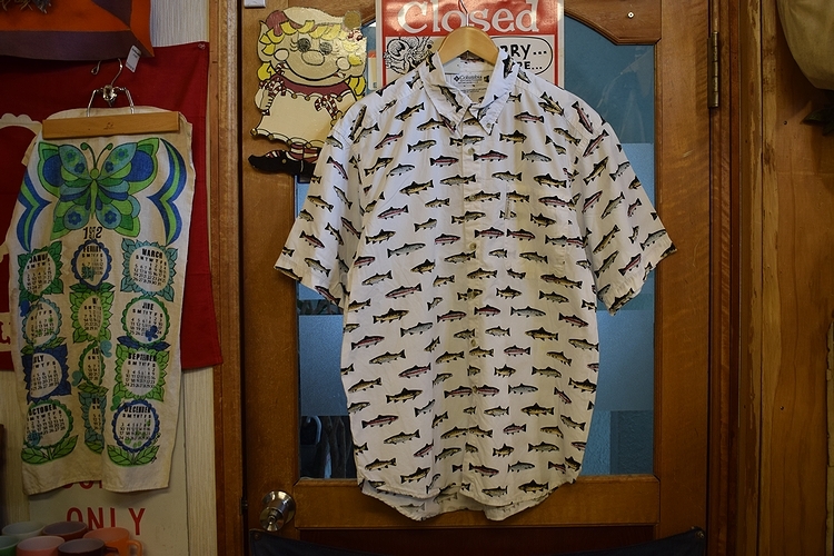 グッドデザイン90sビンテージColombiaコロンビア半袖ボタンダウン総柄シャツ白ベース魚柄オールコットンアメカジアウトドアh25102