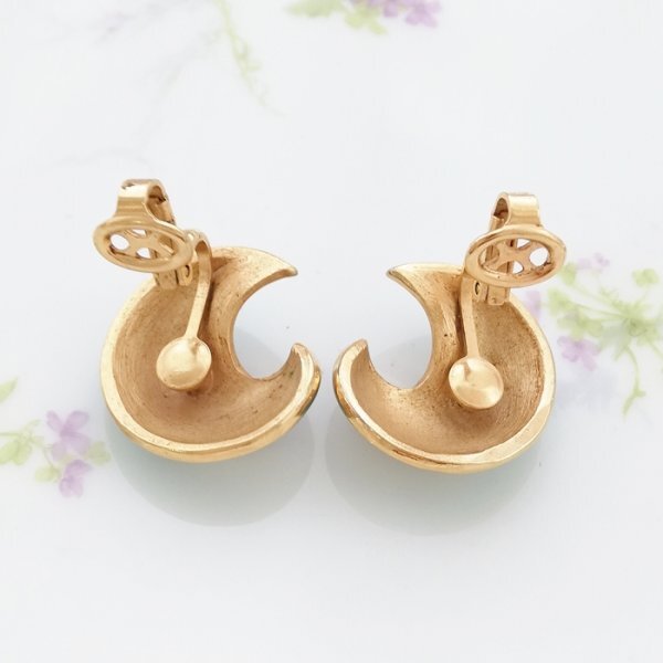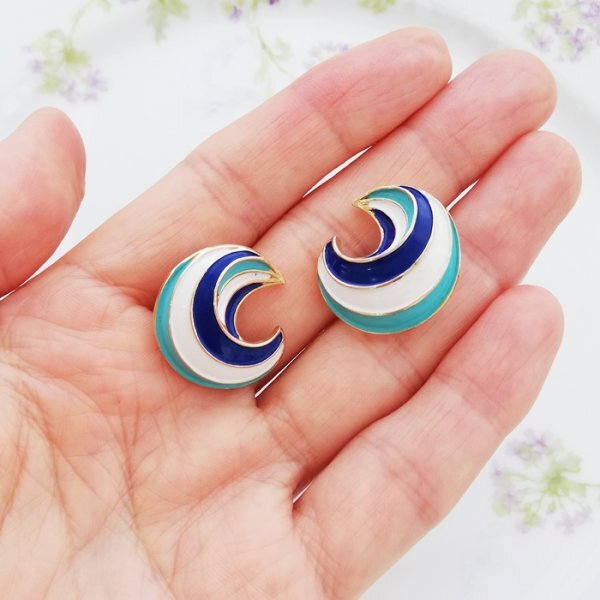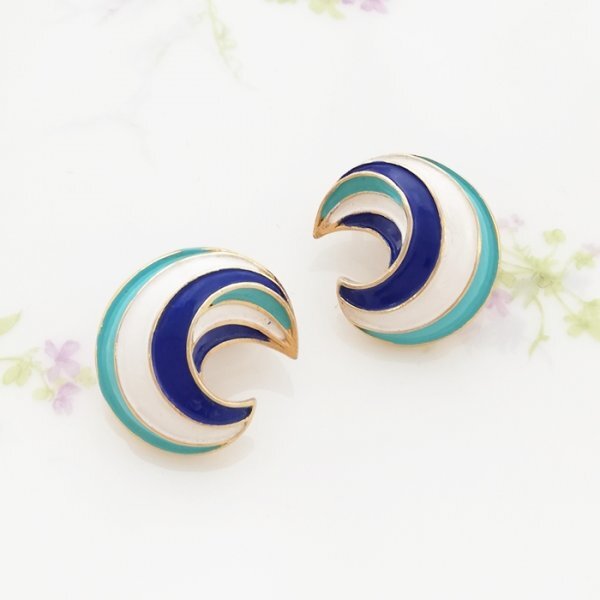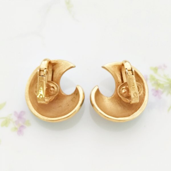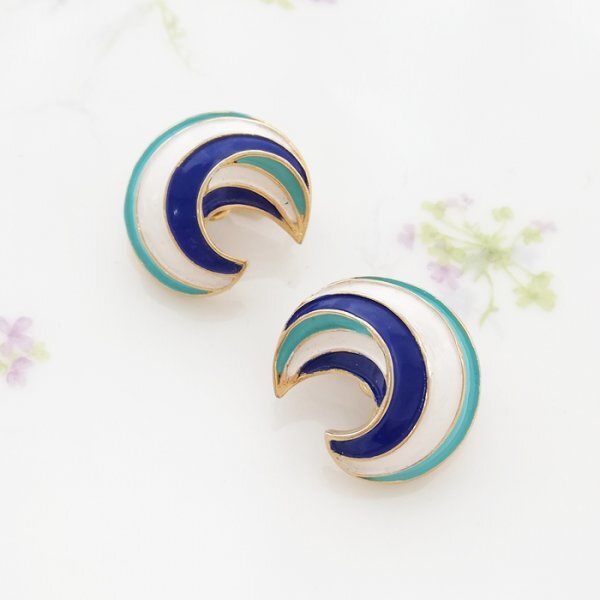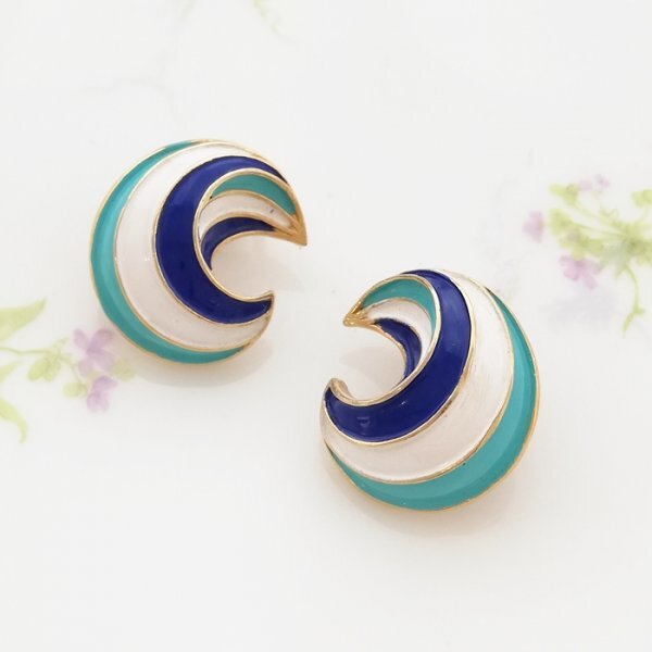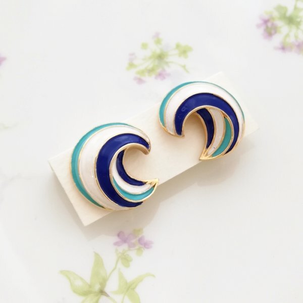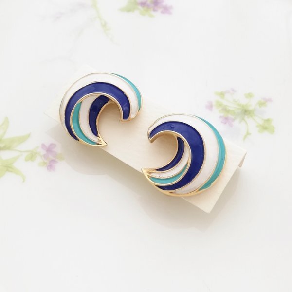 アメリカのコスチュームジュエリーメーカー、Trifariのイヤリングのご紹介です。 ホワイト&ブルーエナメルのイヤリングです。 なめらかに曲線を描いた波の様なデザイン。 ブルーとホワイトの爽やかな色合いです。 クリップオンタイプのイヤリングです。 経年の為、多少の小キズやスレが見られます。 ■ブランド: TRIFARI ■刻印: TRIFARI© ■サイズ: 約2.3cm x 約2.2cm ■重量: 約7g(片方) アンティーク・ヴィンテージ商品には、経年による傷や劣化などがあります。 目立つものはアイテムの詳細に記載しておりますが、説明以外にもキズや損傷などがある場合がございます。 古いものですので、ご理解いただける方のみご入札下さいませ。 他サイトでも販売しておりますので、同時にご注文があった場合は、品切れの場合もあります。その場合は、大変申し訳ございませんが、ご注文をキャンセルとさせて頂きます事をご了承くださいます様お願いいたします。 | |||