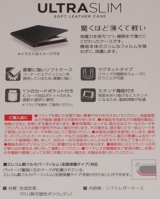 本体の薄さ、軽さを損ねない薄型・超軽量なウルトラスリムタイプのソフトレザーケース(手帳型)です。