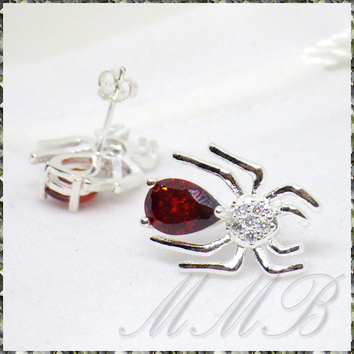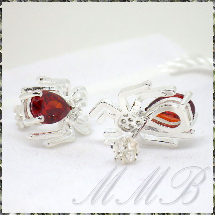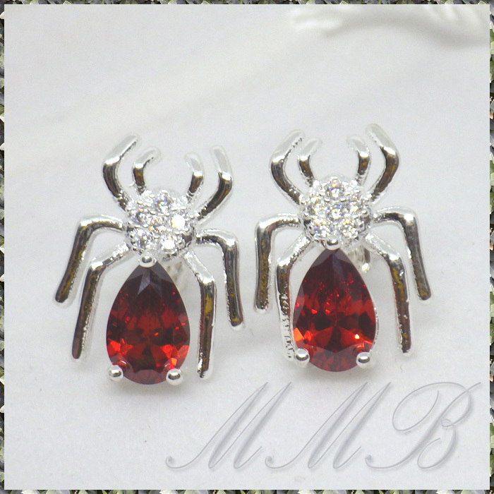 Silver Plated ペアシェイプカット レッド クリスタルCZ スパイダー 蜘蛛(クモ) シルバー スタッド ピアス です。