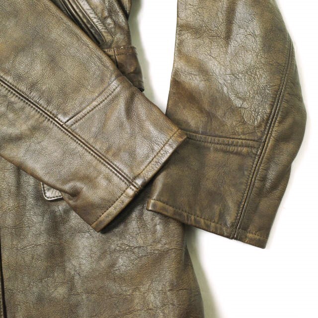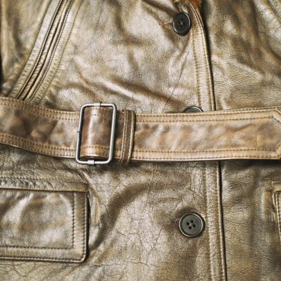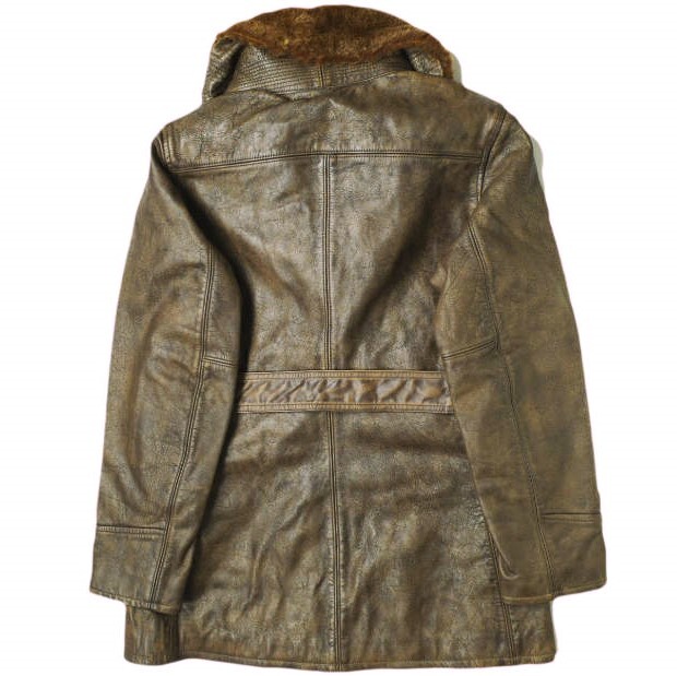 ムートンのショールカラー。特別な仕上げを施し、着込んだ表情を演出。ツイルの総裏地。ポケットにブラッシュ加工のシャモアの裏地。取り外し可能なバックル付きセルフベルト。コロゾボタン。