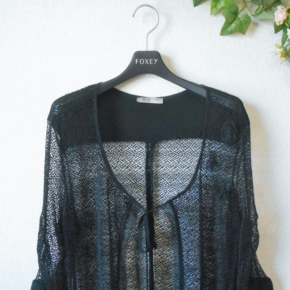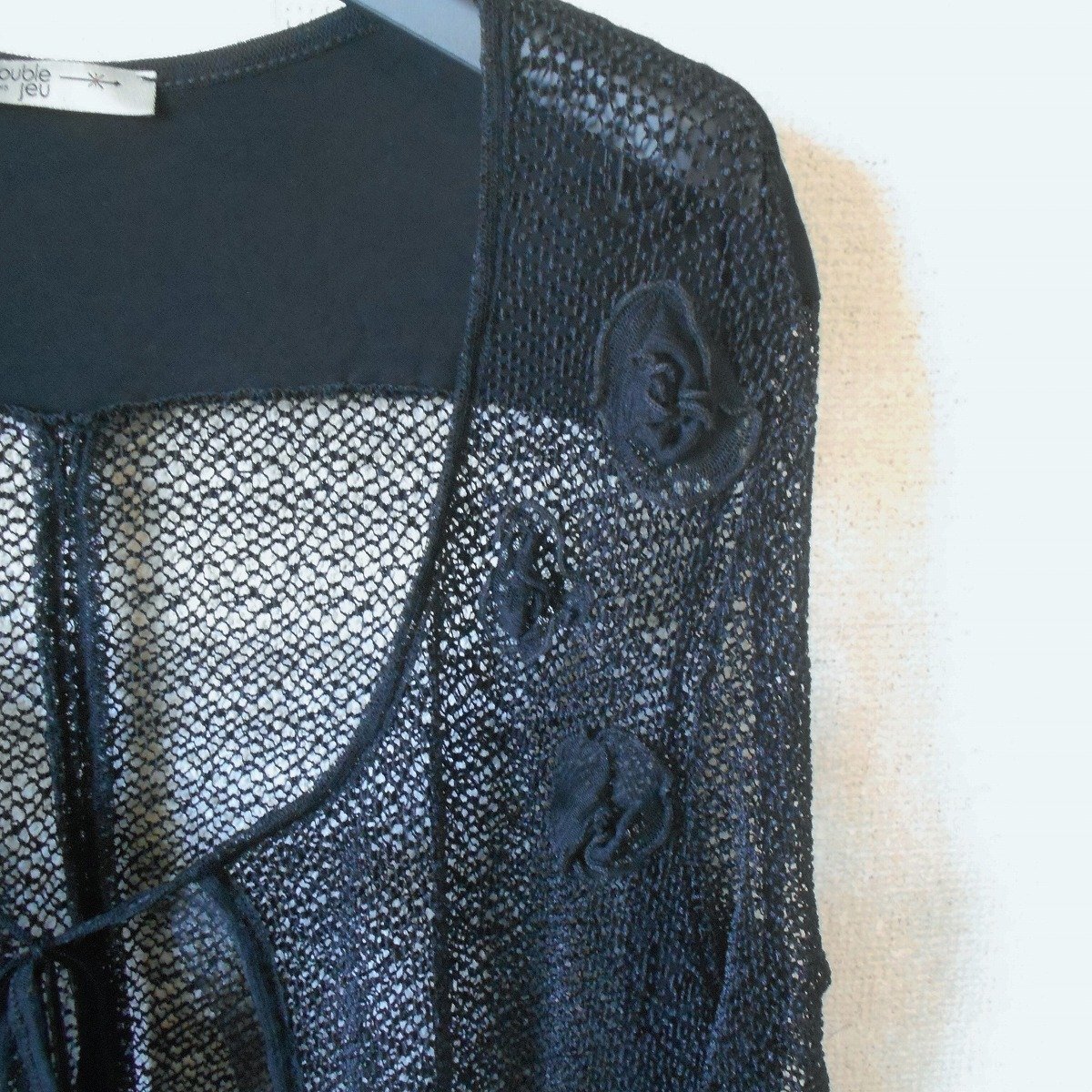 【ポイント】double jeuの夏向きメッシュジャケットになります。お色は黒色で、前はボタン等はなく、首元のひもでリボンが結べるデザインです。