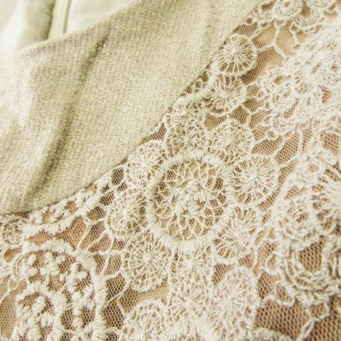 【仕様】素材 薄手 開閉 バックファスナー 伸縮性 なし 透け感 なし ポケット なし 裏地 あり 柄 レース 切り替え ラメ デコルテ、スリーブ部分のニット生地には、ゴールドのラメ糸が編み込まれております