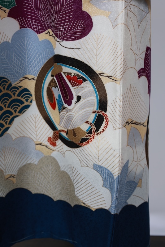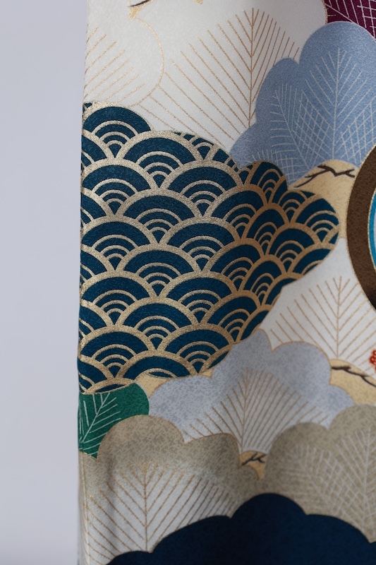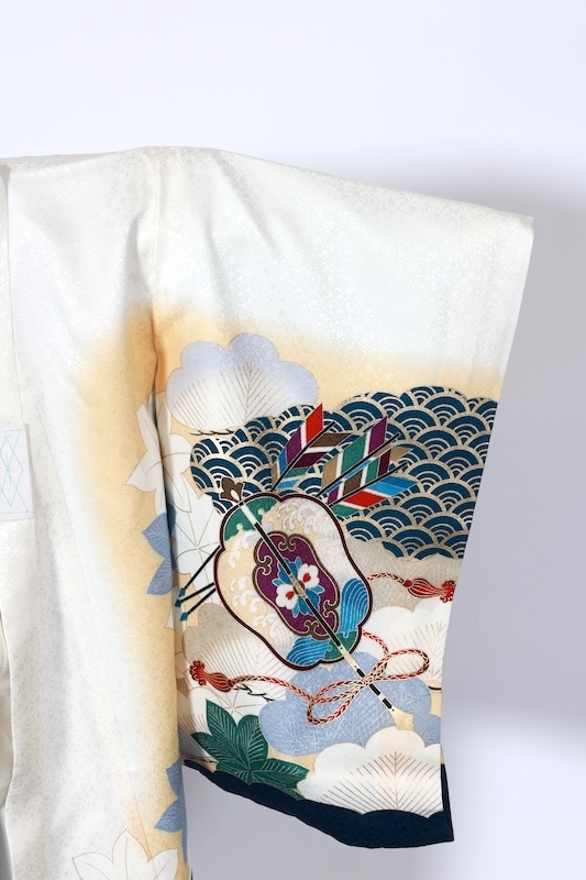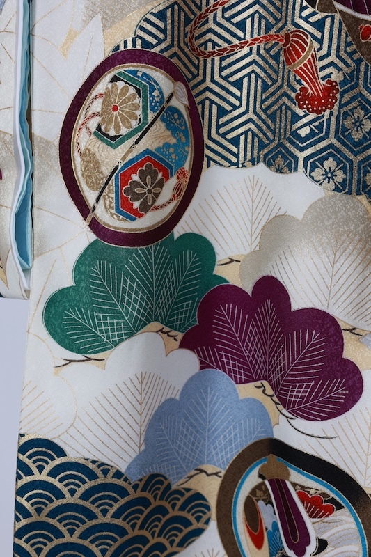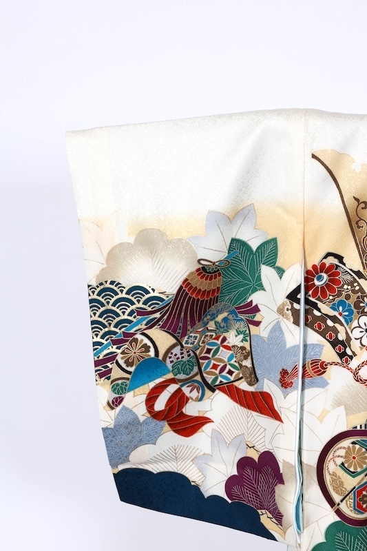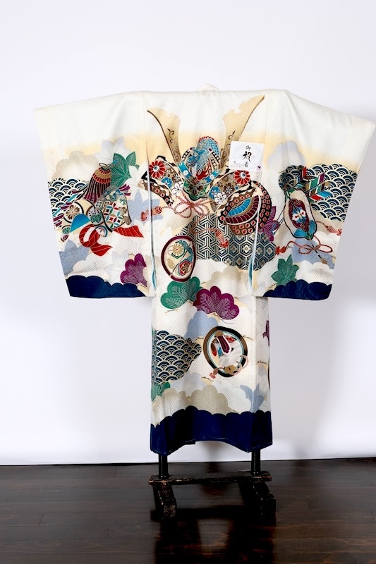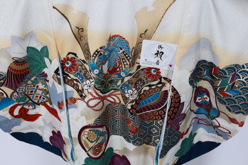 白地をベースに勇壮な兜や吉祥柄の青海波、小槌、松、軍配などを染め上げたお品になります。