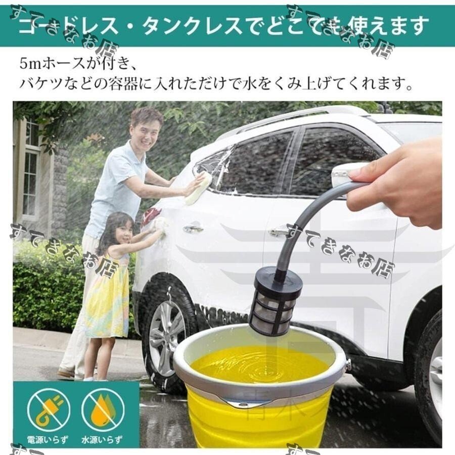 【使用便利】高耐久ブラシレスモーター採用、仕事の効率がアップ。取り扱いの良いコードレス高圧洗浄機、水道、電源が無い場所でも洗浄できます。洗車や壁面掃除はもちろん、アウトドアにもお手軽に使えます。5mホースが付き、バケツなどに入れただけで水をくみ上げてくれます。専用タンクがないので、場所を選ばず使用できます。収納ケース付き、収納に便利なコンパクトサイズ。