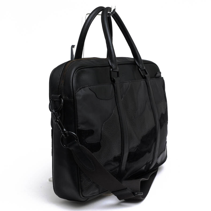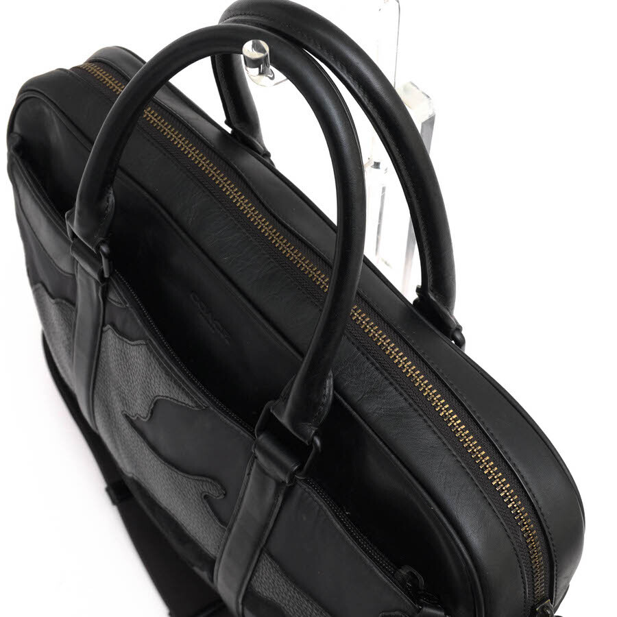 リファインドカーフやペブルドレザーなどの複数のマテリアルを用いた、高いデザイン性と高級感を兼ね備えたブリーフケース。多彩なポケットを備えB4サイズが楽々収納できるので、ビジネスシーンで大活躍。前面にはファスナー付ポケット、後面にはマグネット付ポケットもあり、さっと取り出したい小物の収納に便利です。 |
