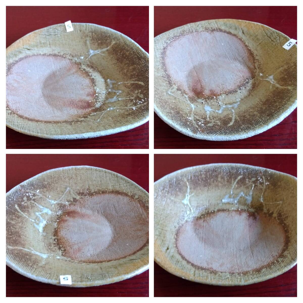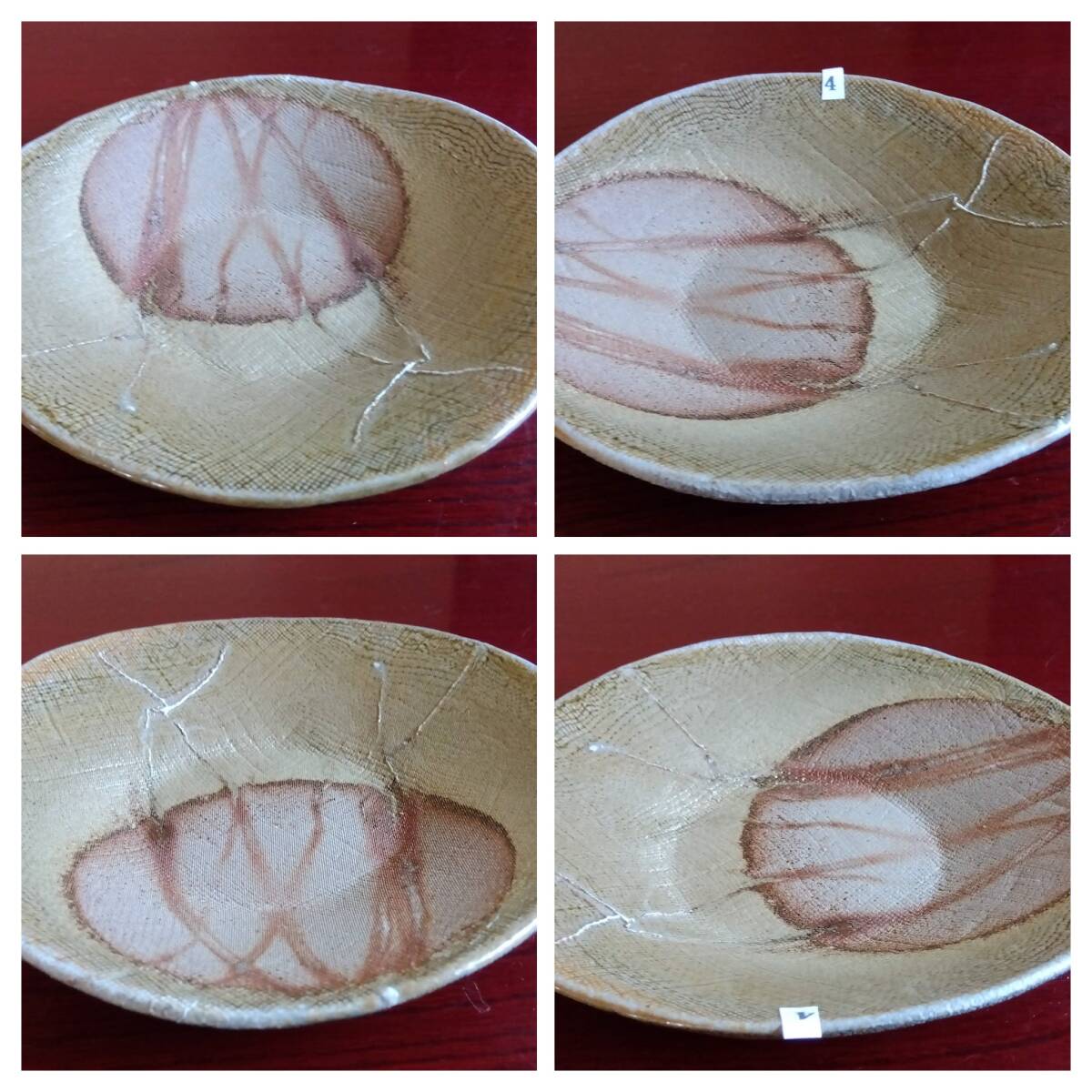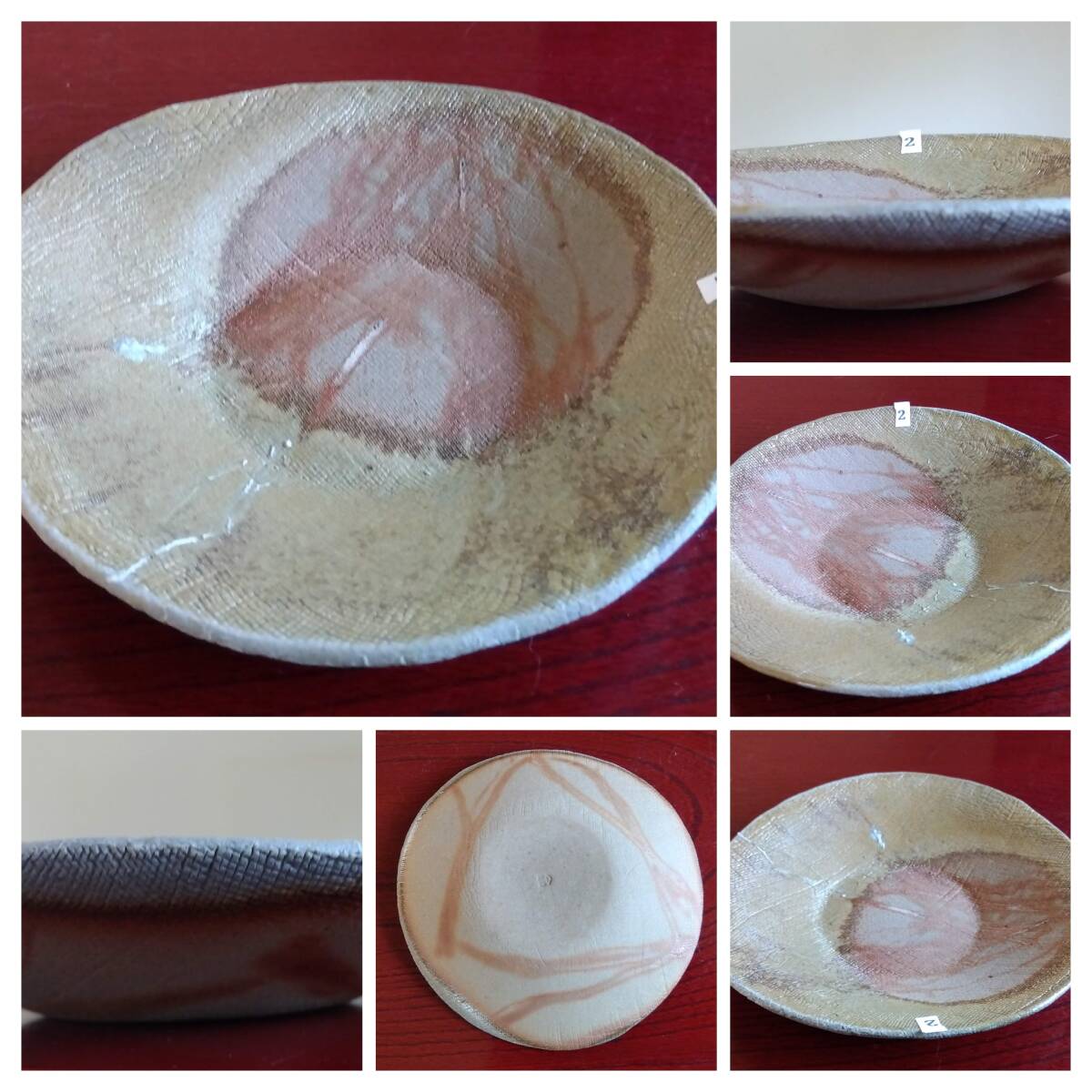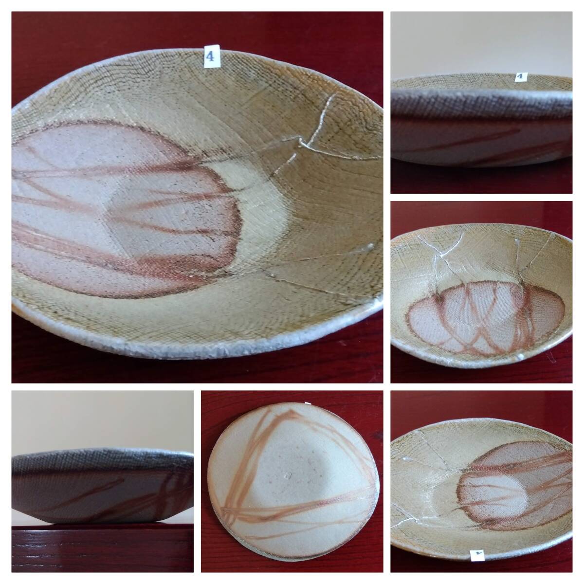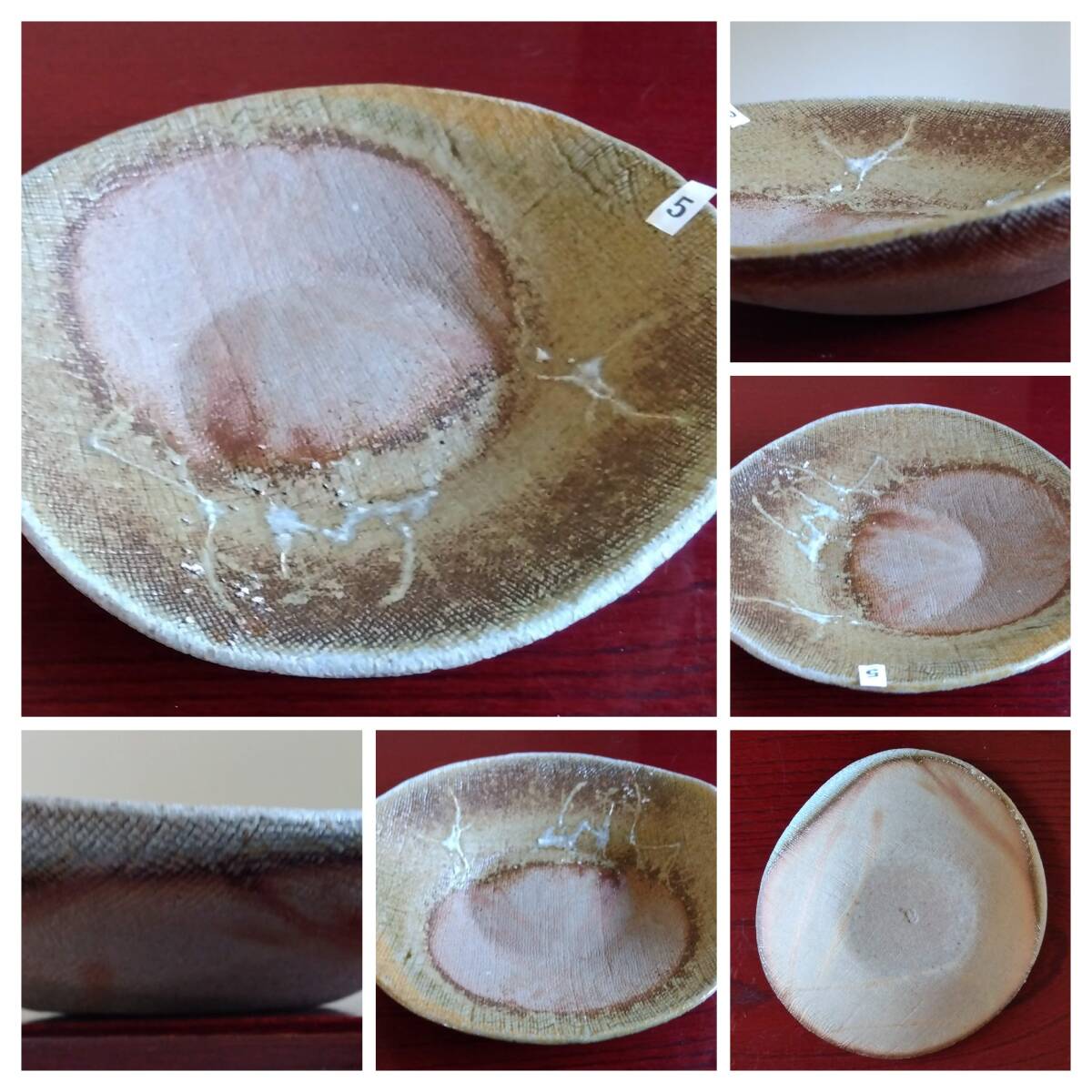 越前焼名工 桝田屋光生 線状赤茶色の鮮やかな緋だすき掛けぼた餅模様向付け小鉢 5点セット 窯の中で器同士がくっつかないように間に藁を巻いて焼く事によって出る線状に赤茶色の鮮やかな緋だすきがぼた餅上に浮き出た見事な景色です。 小鉢全体を覆うタタラ布地網目模様が器全体に施され 越前陶土「青ねば・赤べと・太古土」の鉄分に反応し赤く発色し 線状に赤茶色の鮮やかな緋だすき景色を生み、備前焼緋だすきとは一味違った風趣を漂わせています。 ヨーロッパの磁器にも勝るとも劣らない硬度を達成している5mm前後の薄手の多目的小鉢。 器のデザイン美と品質強度が求められる京都の老舗の料亭に多くの品を納められている事を納得させる氏の卓越した「至高の技」が心和む緋だすき掛けぼた餅景色に焼き上がり、越前焼魅力の世界を再確認させてくれます。 越前陶土「青ねば・赤べと・太古土」を活かす形で作られ、(陶土)が表す独特の質感/強度を最大限に活かす5mmをきる極薄の魅力的な作品です。 サイズ 口径158/165㎜ 胴高28/33mm 見込み22/23mm鉢底径65mm【ぼた餅:大きな皿・鉢の上に小振りの器を重ねて焼くと、その部分には直接炎が当たらず、赤い焼けムラが生じる。丁度、ぼた餅の形に見える面白い変化。まるく赤く抜けるので、まんじゅう抜けとも呼ばれている】出品者覧の【出品中の商品を見る】より 他にも多数の作品を出しておりますので御参照してください。 同梱可能ですので宜しくお願い致します。