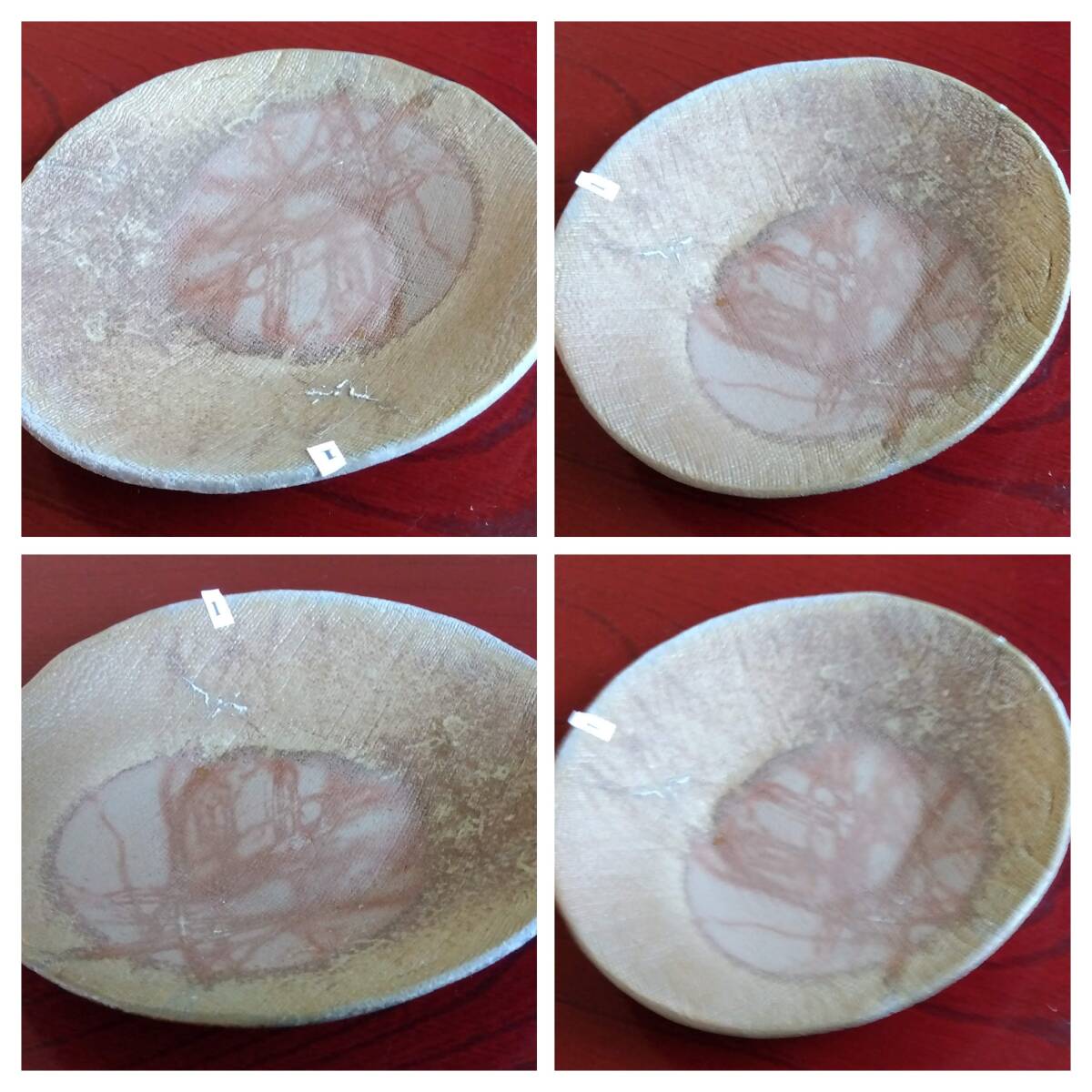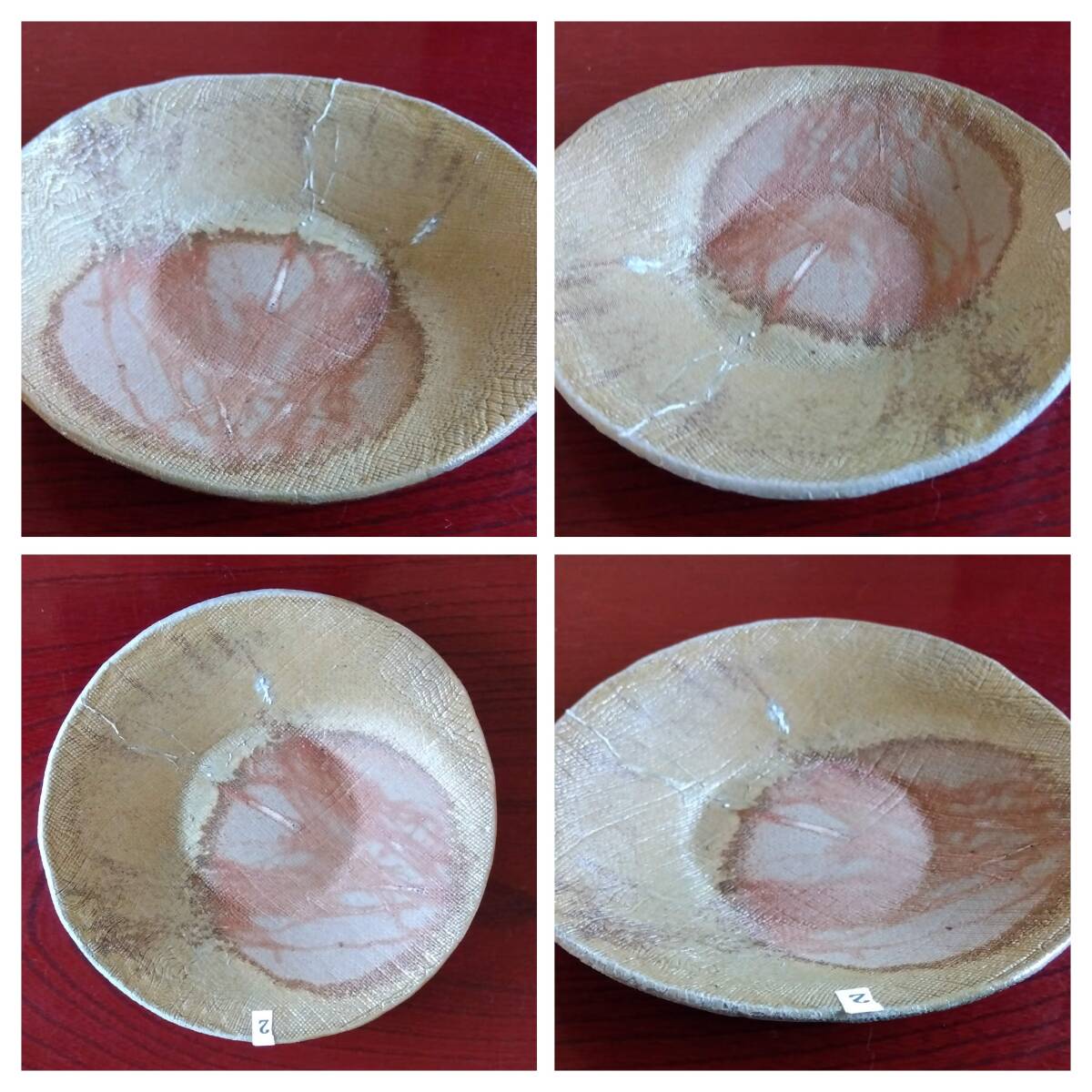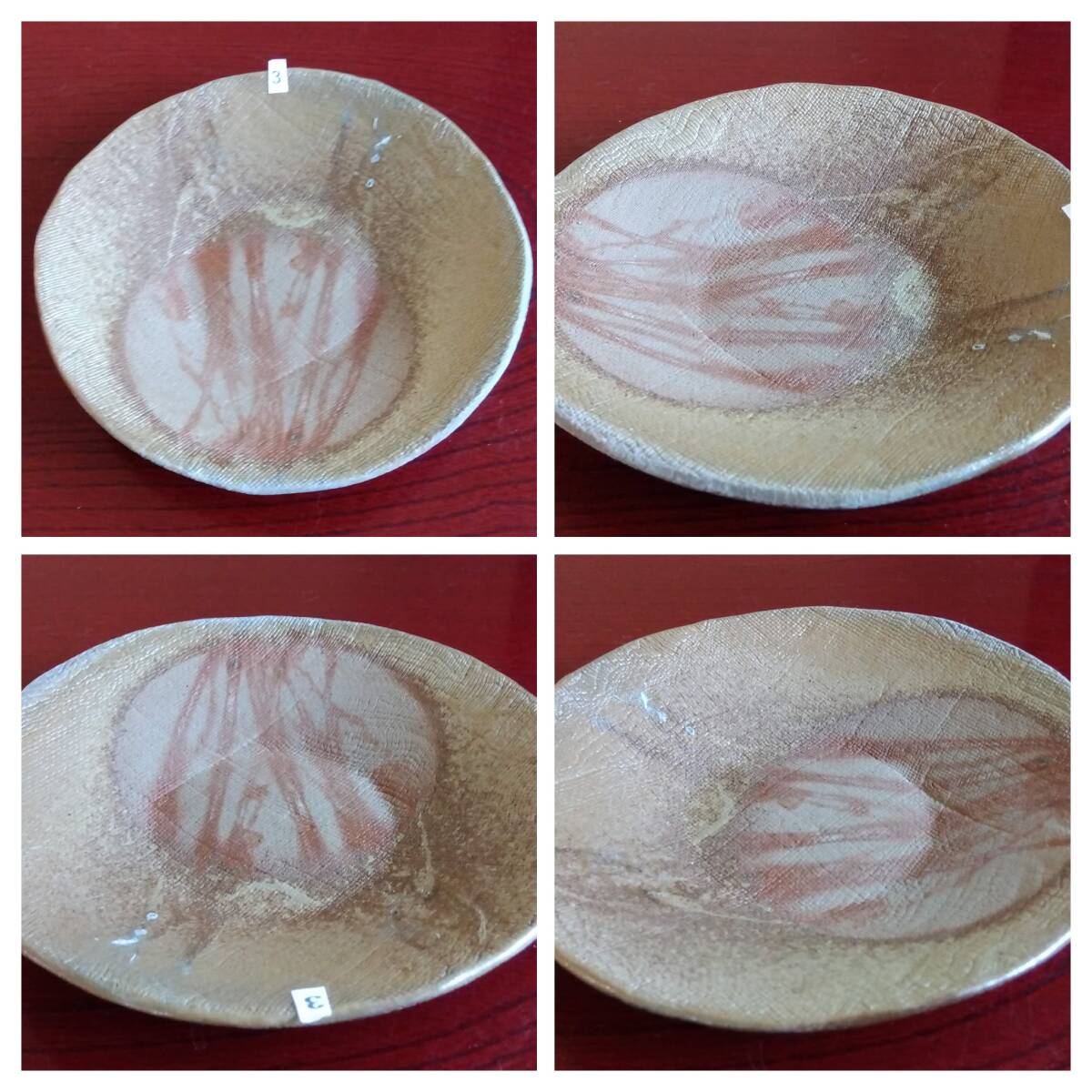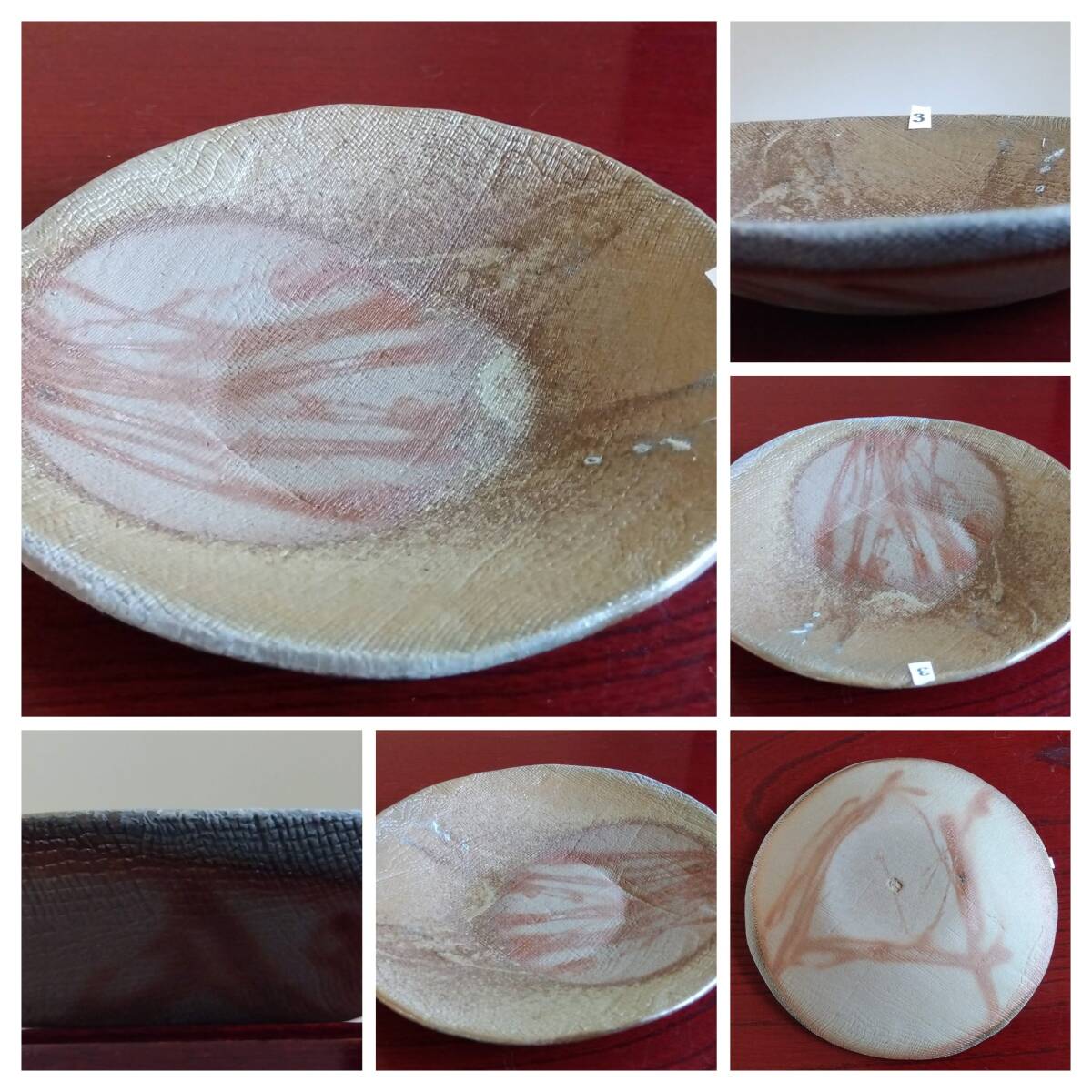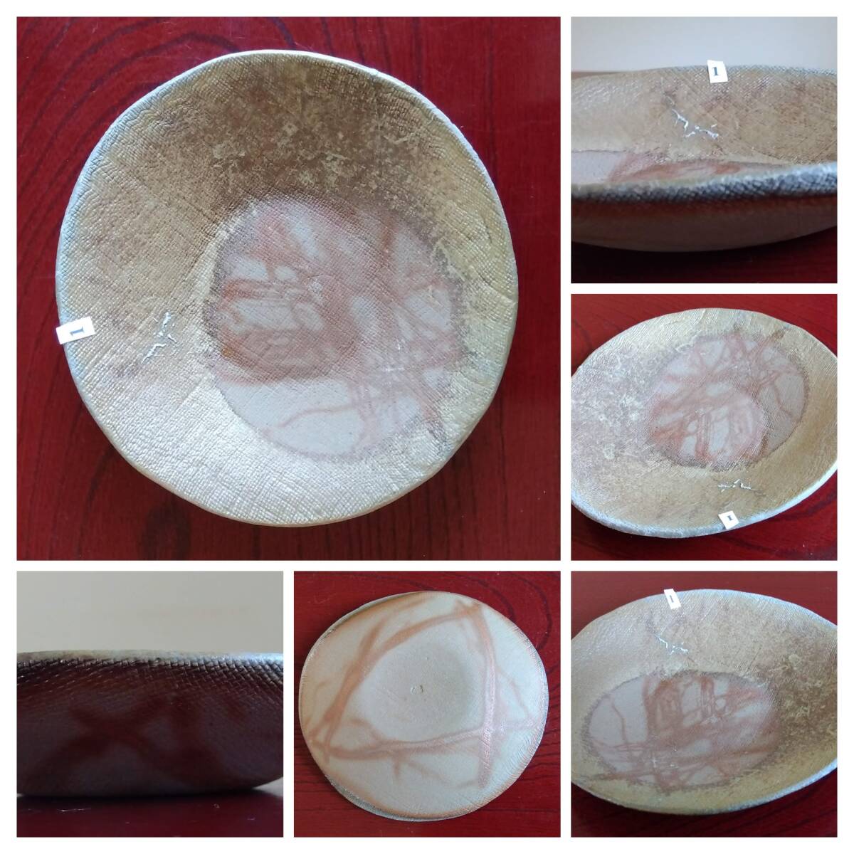 越前焼名工 桝田屋光生 線状赤茶色の鮮やかな緋だすき掛けぼた餅模様向付け小鉢 5点セット 窯の中で器同士がくっつかないように間に藁を巻いて焼く事によって出る線状に赤茶色の鮮やかな緋だすきがぼた餅上に浮き出た見事な景色です。 小鉢全体を覆うタタラ布地網目模様が器全体に施され 越前陶土「青ねば・赤べと・太古土」の鉄分に反応し赤く発色し 線状に赤茶色の鮮やかな緋だすき景色を生み、備前焼緋だすきとは一味違った風趣を漂わせています。 ヨーロッパの磁器にも勝るとも劣らない硬度を達成している5mm前後の薄手の多目的小鉢。 器のデザイン美と品質強度が求められる京都の老舗の料亭に多くの品を納められている事を納得させる氏の卓越した「至高の技」が心和む緋だすき掛けぼた餅景色に焼き上がり、越前焼魅力の世界を再確認させてくれます。 越前陶土「青ねば・赤べと・太古土」を活かす形で作られ、(陶土)が表す独特の質感/強度を最大限に活かす5mmをきる極薄の魅力的な作品です。 サイズ 口径158/165㎜ 胴高28/33mm 見込み22/23mm鉢底径65mm【ぼた餅:大きな皿・鉢の上に小振りの器を重ねて焼くと、その部分には直接炎が当たらず、赤い焼けムラが生じる。丁度、ぼた餅の形に見える面白い変化。まるく赤く抜けるので、まんじゅう抜けとも呼ばれている】出品者覧の【出品中の商品を見る】より 他にも多数の作品を出しておりますので御参照してください。 同梱可能ですので宜しくお願い致します。