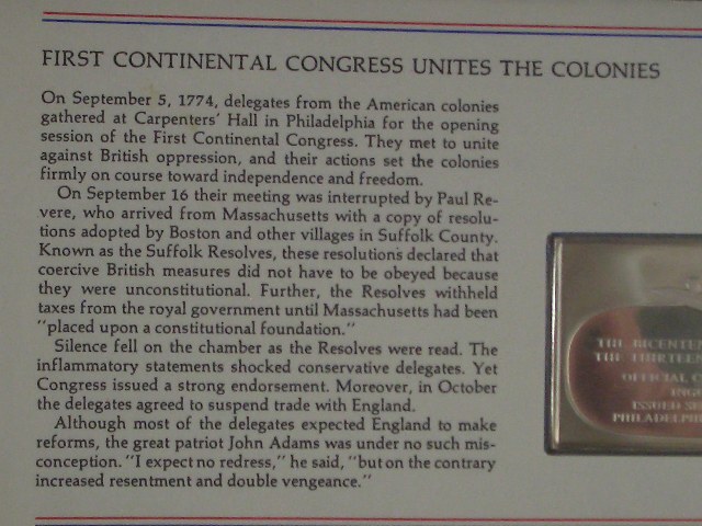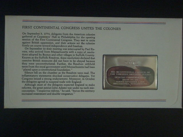 The Bicentennial Council of the 13 Original States Commemorative Silver Ingot  "First Continental Congress Unites the Colonies". Franklin Mint 社の Sterling Silver Ingot (.925 / 約 51g.)。 (FM5E)