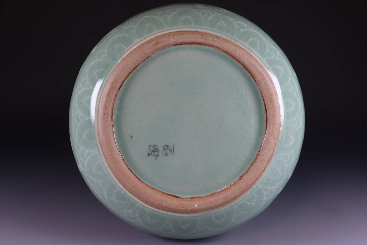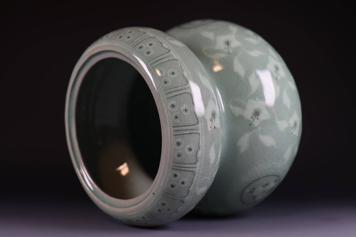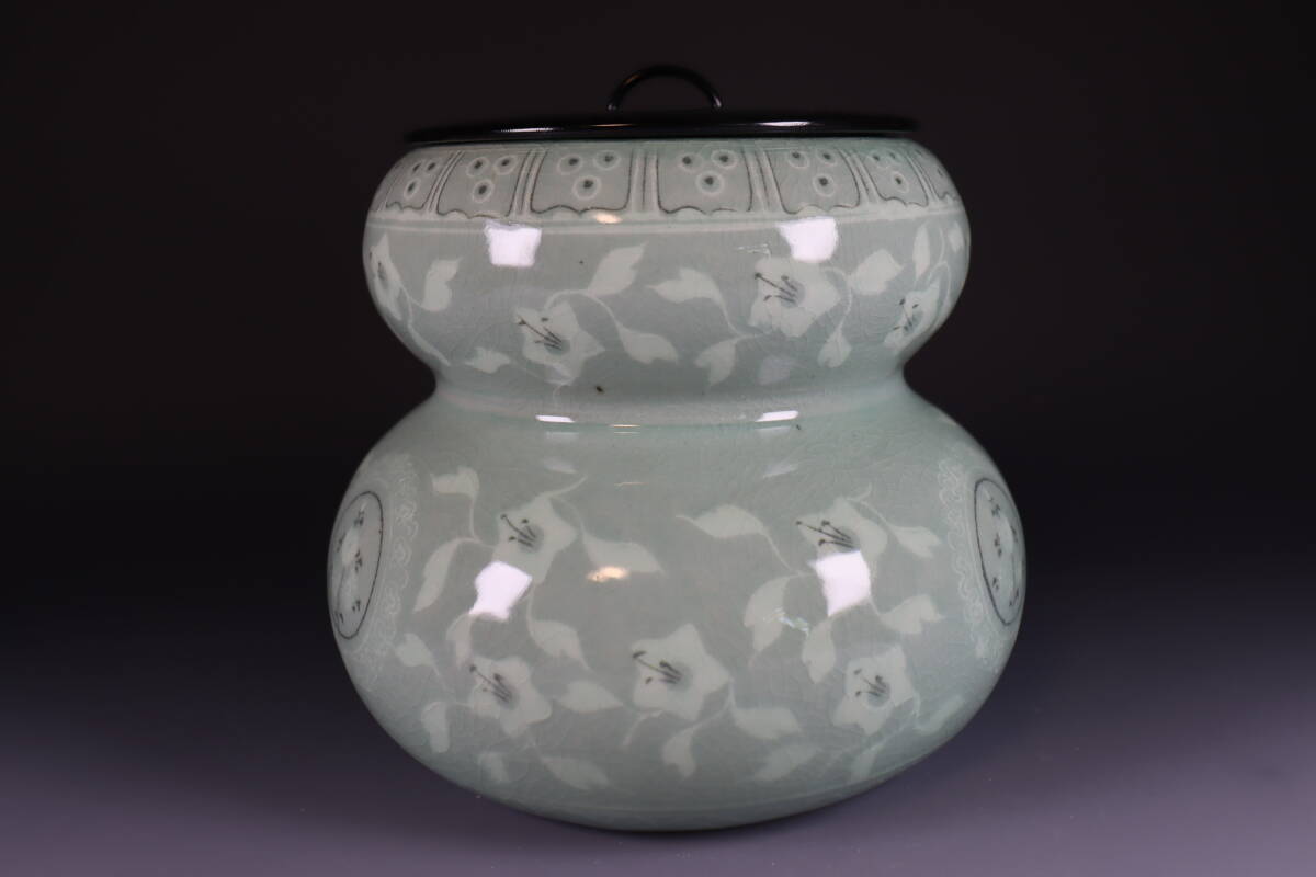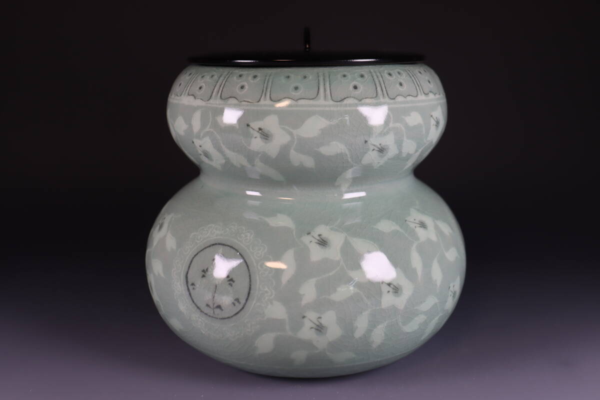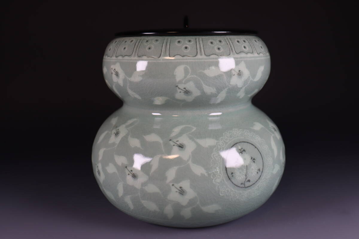 商品説明 | 商品名:蔵出し品 韓国人間国宝 柳海剛 高麗青磁象嵌菊花文 瓢形水指 付属品:四方桟共箱、陶歴、共布あり。 サイズ:高さ17cm、口径11,8cm、高台12,3cm。 状態:無傷になります。 |