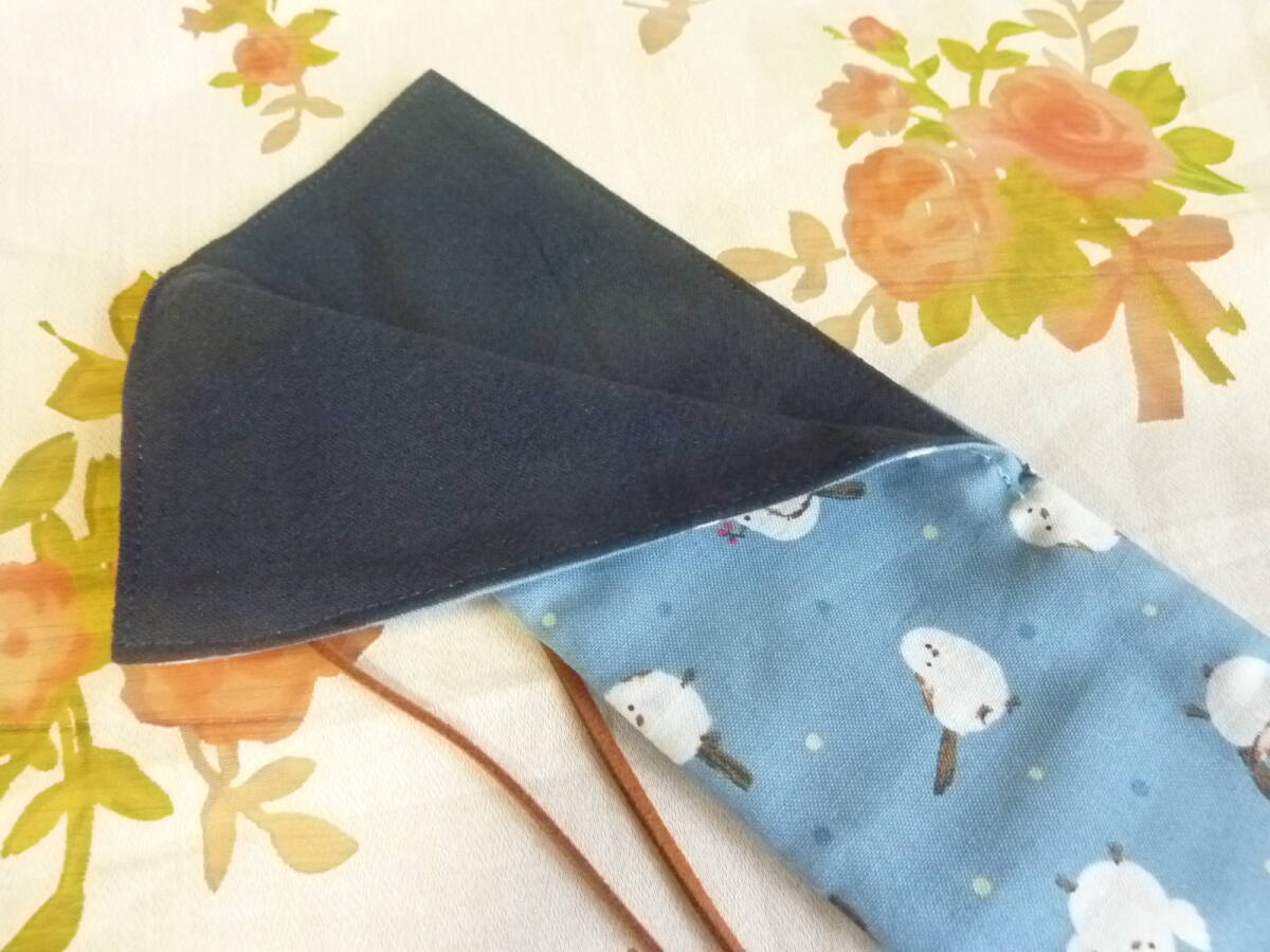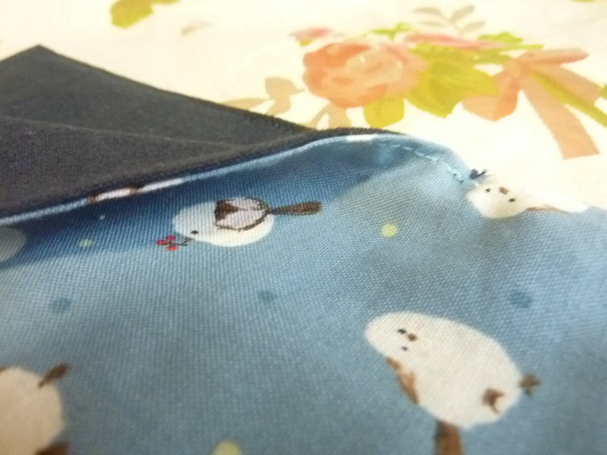 綿100%、表地はくすんだ青系のかわいいシマエナガ模様、裏地は紺の無地です。