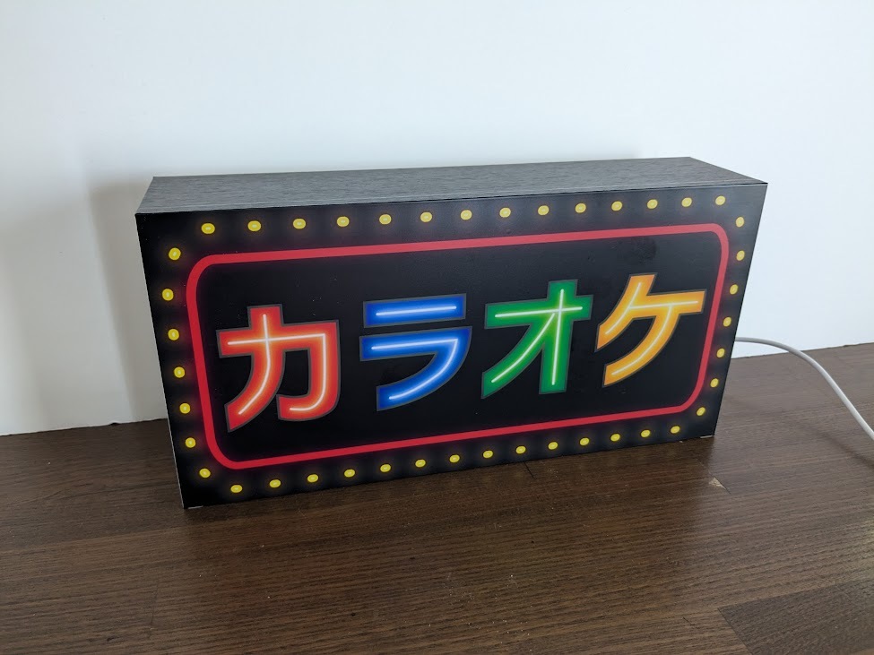 店舗、自宅、ガレージ、オフィスの窓際・カウンター・棚・テーブルやちょっとしたスペース、車内・キッチンカー・屋台・イベント・パーティーなどに 邪魔にならず丁度良い大きさの【昭和レトロなカラオケ】電飾看板Lサイズです★ オーダー無料、プレゼントにも大変好評頂いております★ ◆サイズ◆20センチ×40センチ×奥行き7センチ ◆材質◆本体(アクリルプラスチック製)・表示面(IJバックライト発光フィルム貼り) ◆電源◆USB供給電源(家庭用コンセントコネクタ付き) 〇他サイズ〇 ●Sサイズ 75mm×150mm (3D造形BOX黒本体) ●基本サイズ10センチ×20センチ (3D造形BOX黒本体) ●Mサイズ 150mm×300mm ●LLサイズ 300mm×600mm ●3Lサイズ 400mm×800mm ●4Lサイズ 500mm×1000mm ◆オリジナルデザイン・オーダーも承っておりますので、お気軽にお問い合わせください。 自社製造製品 店舗 自宅 キッチンカー フードトラック 屋台 パーティー イベント サイン ランプ ライト 照明 看板 インテリア雑貨 置物 雑貨 テーブル カウンター 電飾看板 電光看板 光源の種類...LED