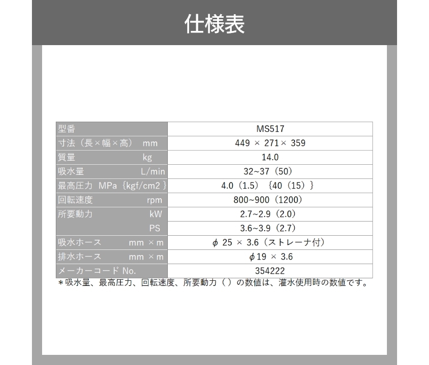 ※吸水量、最高圧力、回転速度、所用動力()の数値は、濯水使用時の数値です。