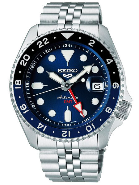 新開発のGMT ムーブメントにより、ヘリテージデザインが美しく進化。世界中から愛されたスポーツウオッチ「SKX モデル」を土台に開発した新生セイコー5スポーツを、更に美しく進化させたモデルです。搭載される新開発のメカニカルキャリバー「4R34」は、GMT 機能を搭載し、時針と24 時針(GMT 針)がそれぞれ別の時刻を示すことで、時差のある2 つのタイムゾーンの時刻を表示する事が可能です。昼夜が瞬時にわかる2 色の回転ベゼルの表示板には、艶やかなハードレックスガラスを選択。蒸着処理によるメタリックな色調が美しく輝き、光の照射角度により異ります。