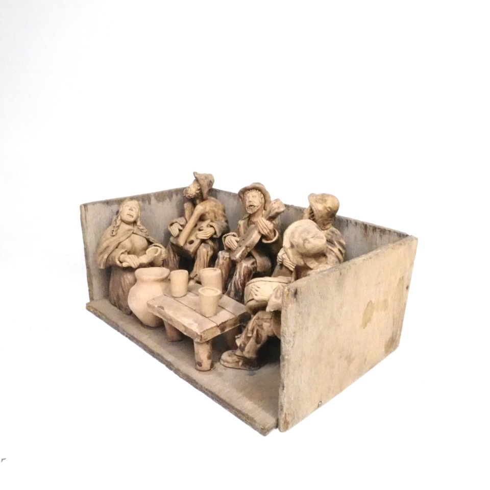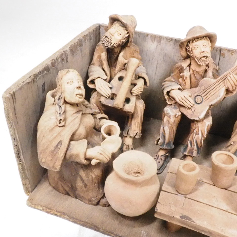 ビンテージ 海外作品 陶芸品 陶人形 ハンドメイド作品「音楽家の集い」 木製の枠付 1900〜1930年代頃 TKA606