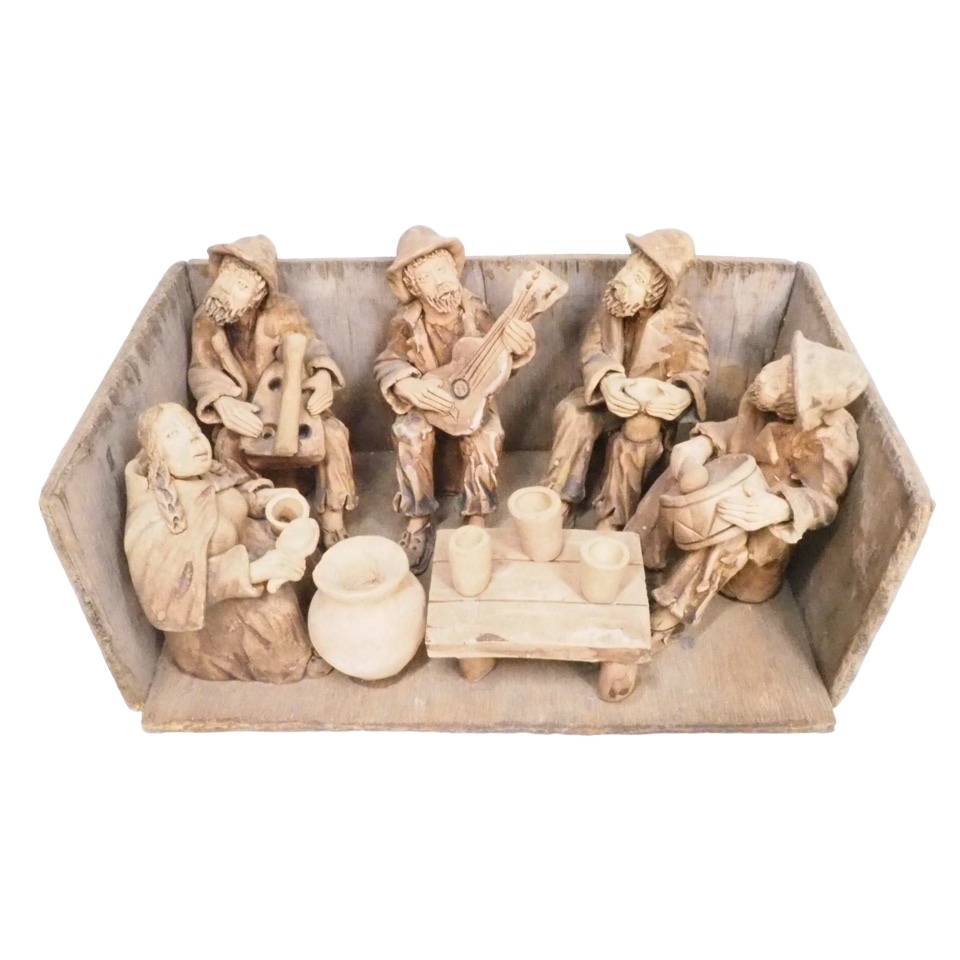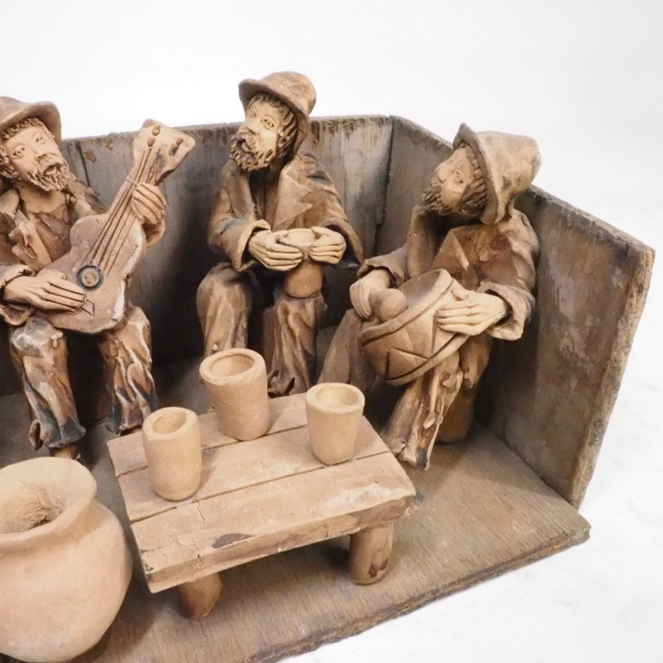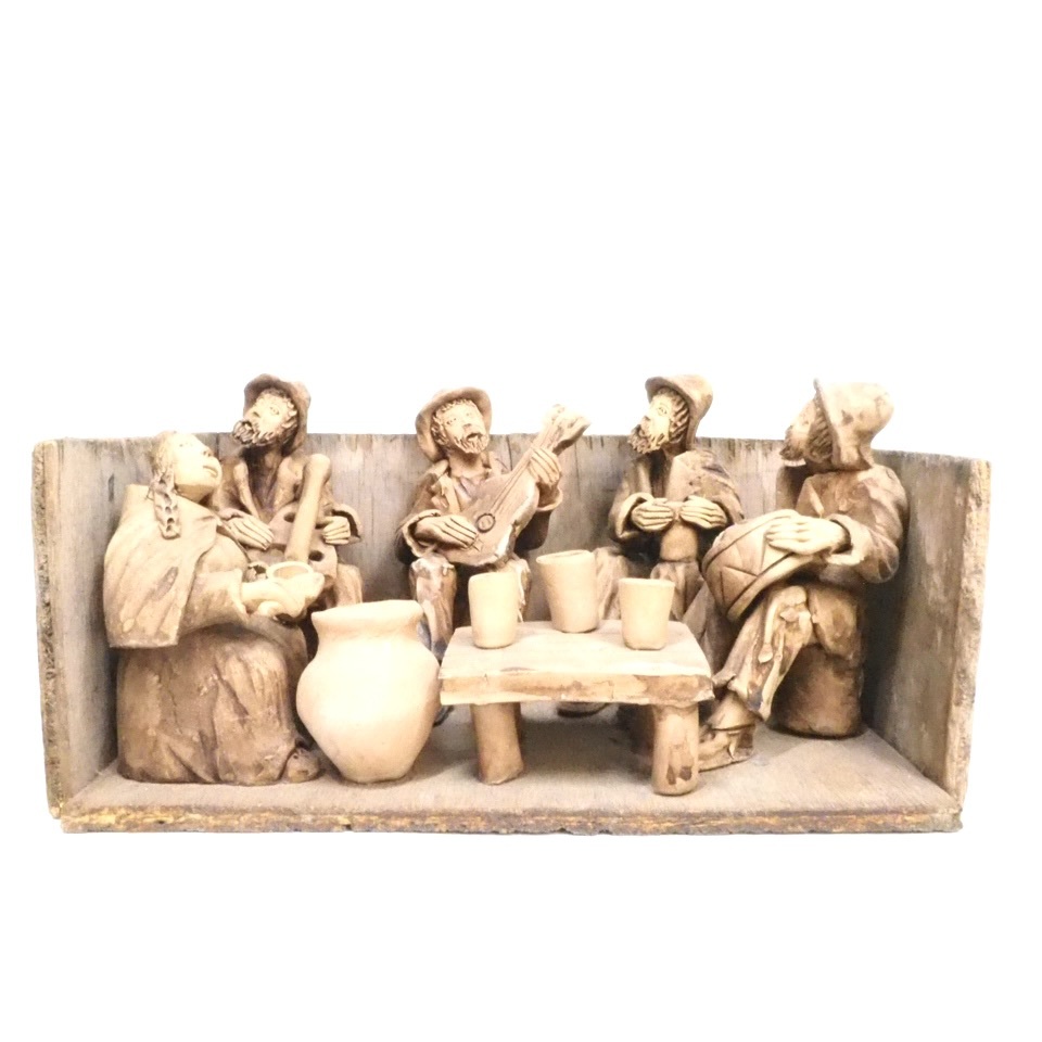 ビンテージ 海外作品 陶芸品 陶人形 ハンドメイド作品「音楽家の集い」 木製の枠付 1900〜1930年代頃