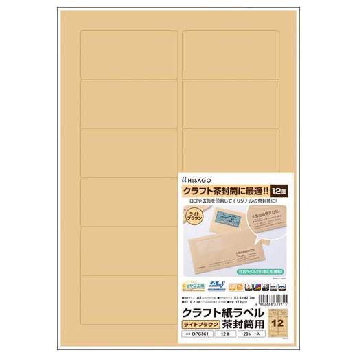 クラフト紙ラベル ライトブラウン 茶封筒用 A4 12面 ■ シートサイズ: A4 (210mmx297mm) ■ 厚さ: 0.21mm (ラベルのみの厚さ: 0.11mm) ■ 坪量: 179g/平方メートル ■ 素材: クラフト紙 ■ ラベルサイズ: 83.8mmx42.3mm
