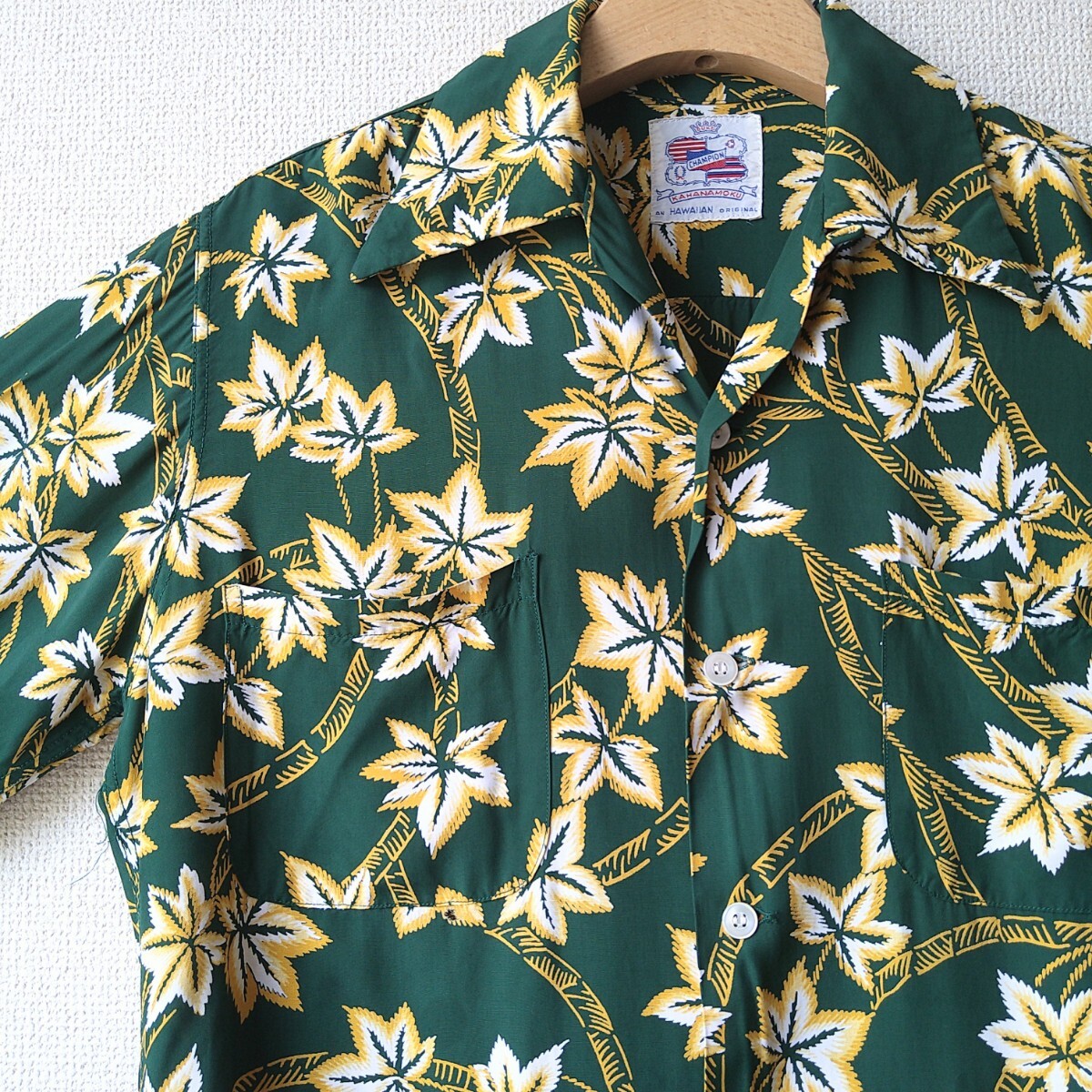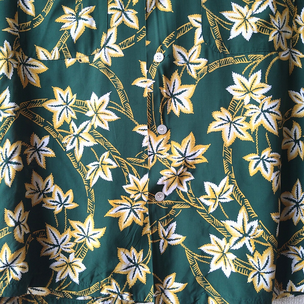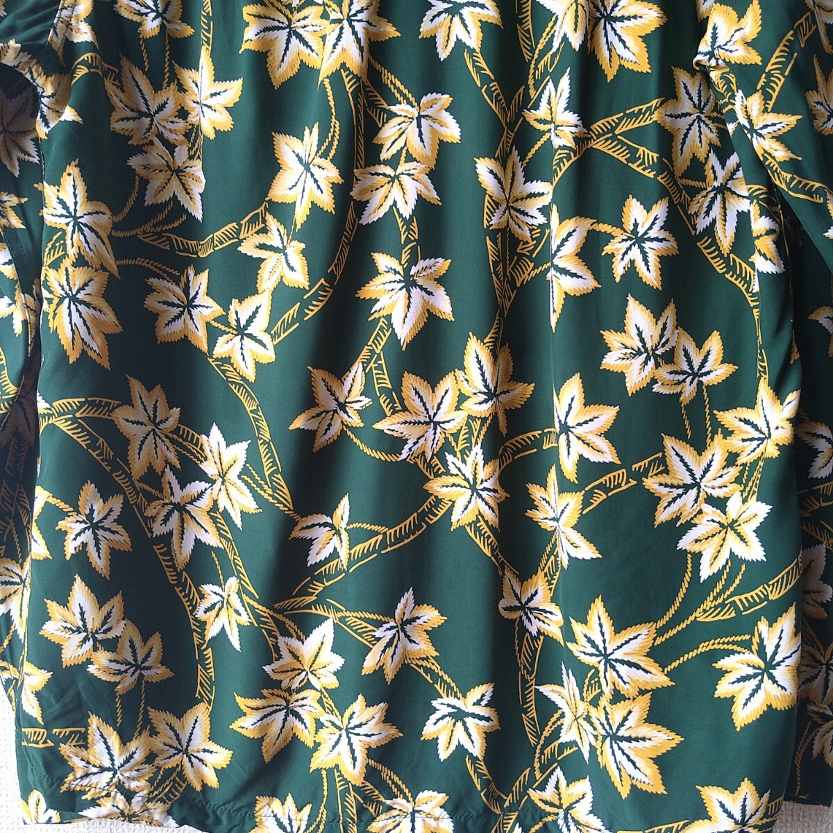 大胆かつ繊細なボタニカルパターン、ギャザリング、大ぶりな袋襟など、まさに1940年代~1950年代のアロハシャツ黎明期を象徴するような見事な作りです。