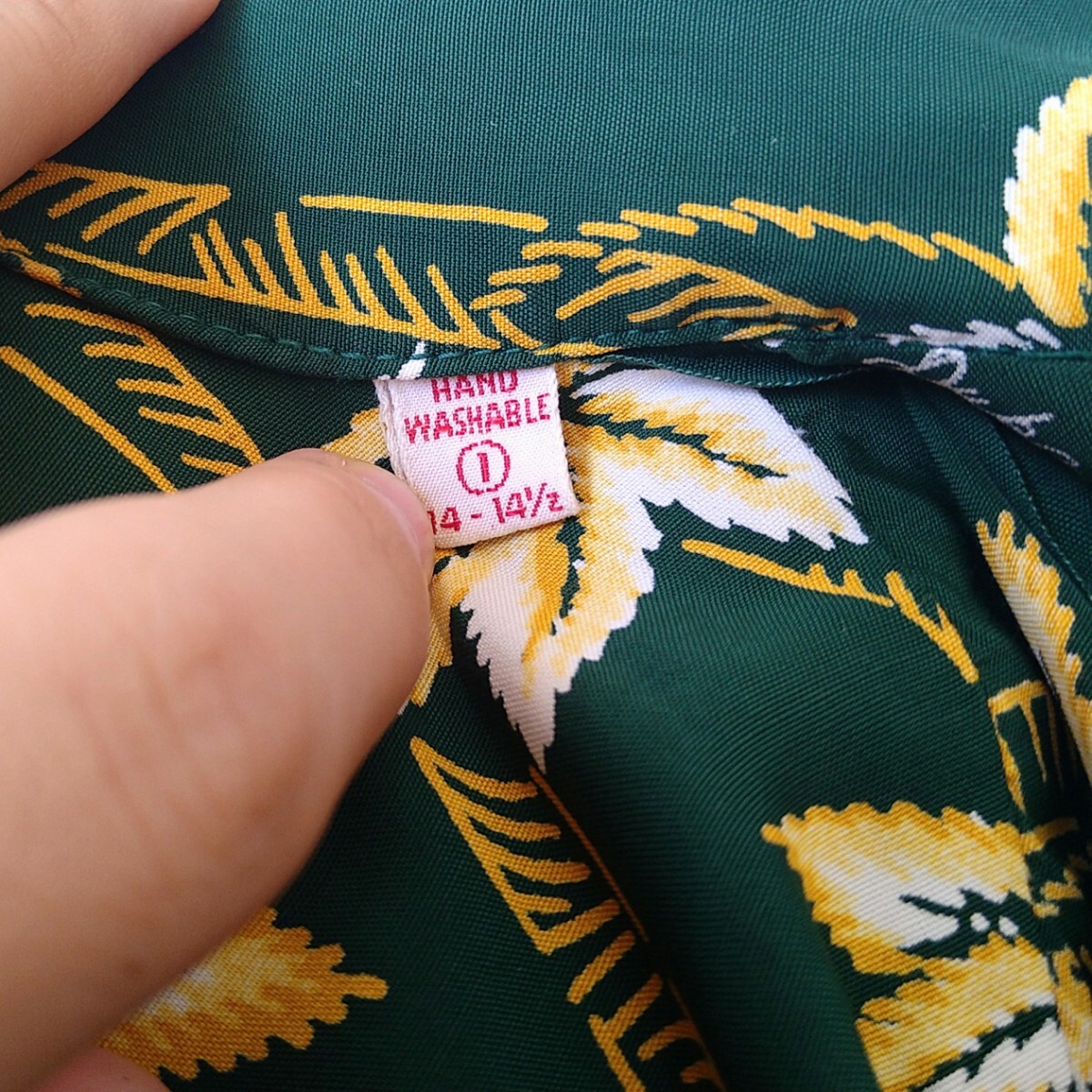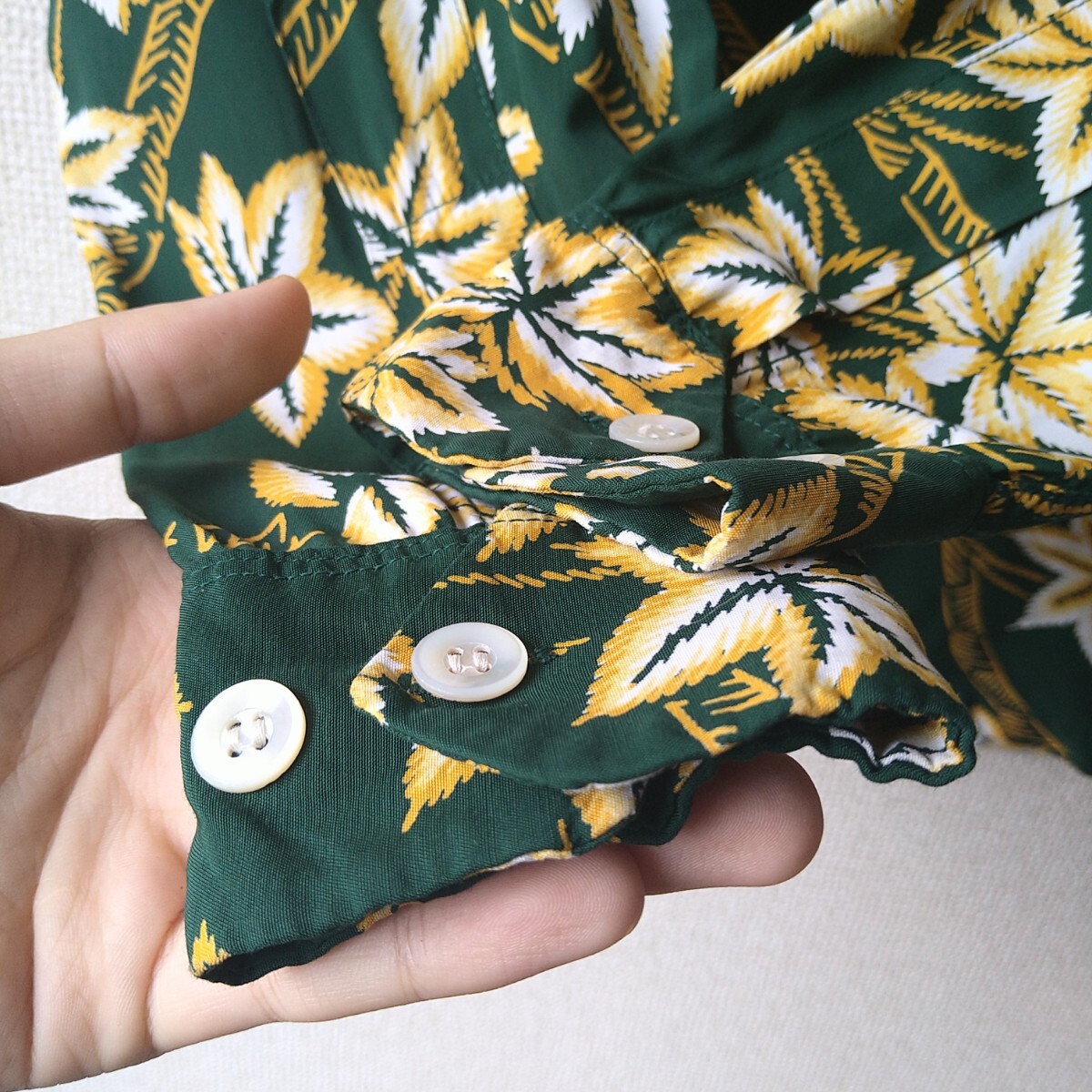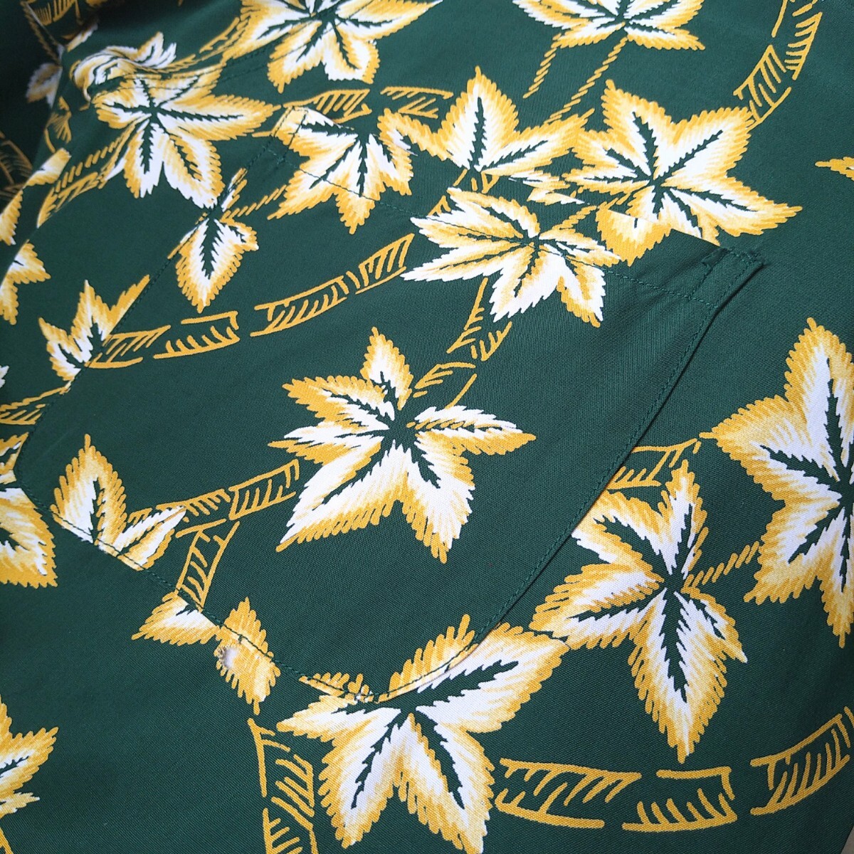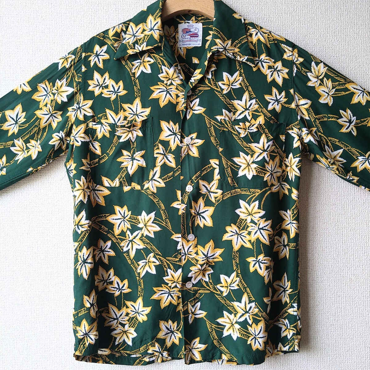 大胆かつ繊細なボタニカルパターン、ギャザリング、大ぶりな袋襟など、まさに1940年代~1950年代のアロハシャツ黎明期を象徴するような見事な作りです。