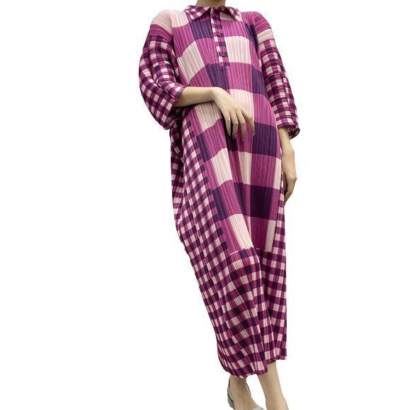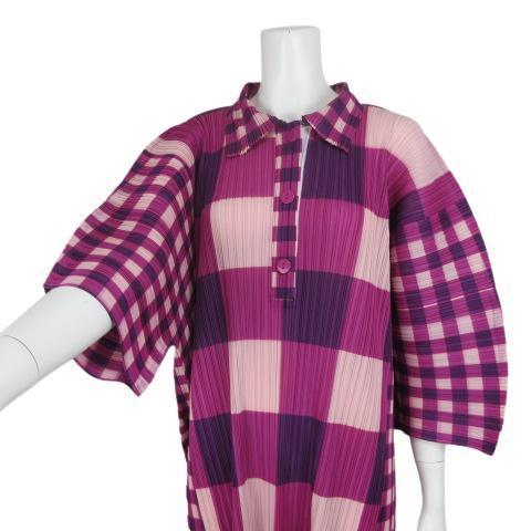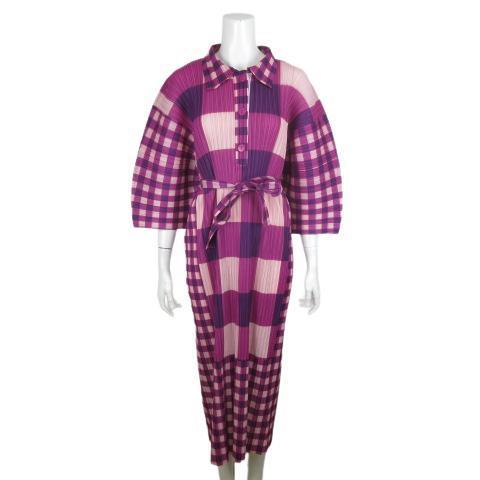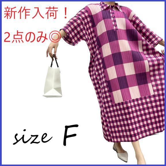 【新品未使用】高級 ギンガムチェック プリーツ ハーフシャツ ワンピース パーティ ドレス F 洗濯OK ポロ ロング マキシ丈