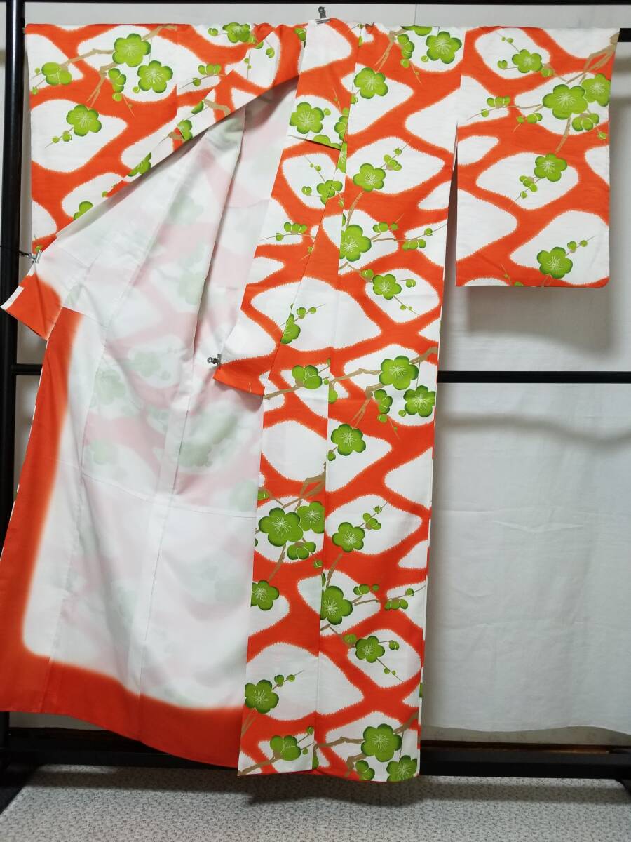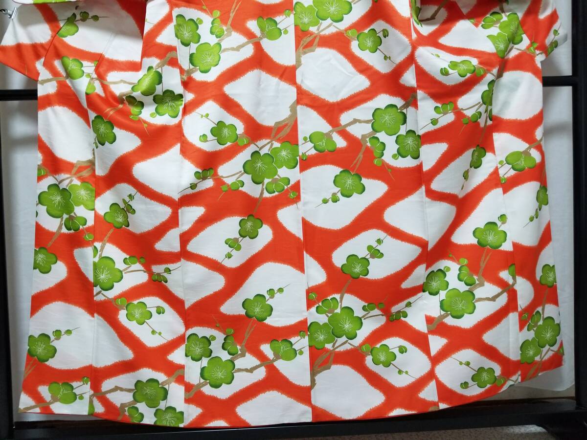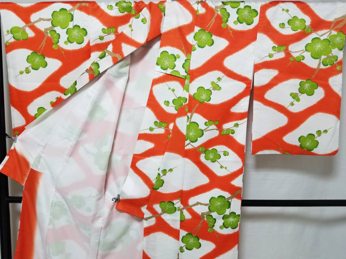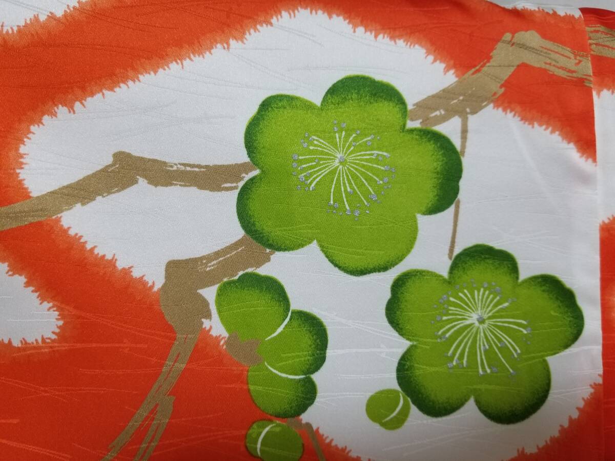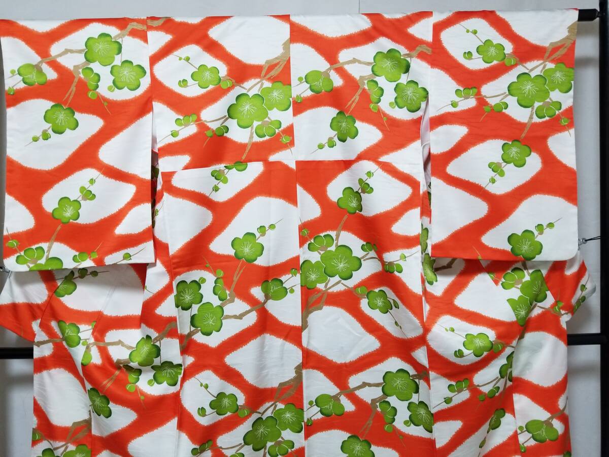 *中古品 *未使用品 *検品済 *美品 {生地} ☆高級ポリエステル100%地 紋繻子 縮緬地 {重目地} ☆着物重さ 約 710g {地色} ☆赤色地 {模様} ☆赤色地に白抜きの菱文の中に「緑*黄緑色の暈し染の梅の花」 ☆枝は茶色 ☆花芯は「白染と銀加工の点々」加工 {胴裏地} ☆高級ポリエステル100%地 羽二重地 {純白色}*美品 {八掛地} ☆高級ポリエステル100%地 精華 縮緬地{紅緋色}*美品 ◎消費税は.お預かりしておりません◎ {寸法} 身丈 {肩から裾まで} 約159cm 裄丈 約64.5cm 袖丈 約57cm 袖幅 約32.5cm 前幅 約22.5cm 後幅 約30.cm *広衿 (発送方法) ●大阪から ゆうぱっく発送 80サイズ{補償あり} ●定形外郵便 920円 {補償なし} ◎t6227jp 桐輪 「呉服の桐正」でも色々と出品しております**同梱発送可能◎ {注意事項} (注意事項 必ずお読みください!) ★基本的に土、日、祝日、ゴールデンウィーク、お盆、年末年始はお休みさせて頂いておりますので、ご連絡が遅れる場合もございますので、ご了承ください。 ★どうぞ自己紹介欄も、是非御覧になって下さいませ。 ●落札後にヤフーから届くメールに、メッセージを記載しておりますので、 そちらも必ずご覧下さいませ。 ●当方、ストア出品ではなく、一日中パソコンに向かっておらず、ご連絡は夜になる事が多いです。その点御理解の上、ご入札下さい。 ●お急ぎの場合など、到着希望の日にちが特に近い場合、ご要望にお答えできかねる場合もございます。もちろん、出来る限り、早急に対応はさせて頂きますが、その点は、何卒ご了承下さいませ。 入札前に、発送が間に合うかご質問頂けるとありがたいです ★★基本的に返品、クレームはお受け致しておりませんが、万が一、商品に不都合(大幅な寸法間違い 記載以外の着用不可能な位の、大きなシミ、傷みなどの見落とし)などがございました場合、まず、取引ナビにてご連絡下さいませ。 迅速に対応させて頂きます。 ただし ●商品がお客様の元に到着後、1週間以上経過したもの。 ●お客様側で加工など、手を加えた物。 ●お色目が、思っていたものと違っていた、または、思っていた感じと違っていた。 (画像はできるだけ実物に近い色で写るように努力していますが、素人の撮影ですので、どうしてもPCによって多少違ってくる事があります。出来るだけ、分かりやすいように説明は入れさせて頂きます。分かりにくい場合、ご質問下さい。) 以上につきましては、対応出来ませんので、ご理解下さい。 ★複数商品の落札予定のある場合、ご連絡頂きましたら、1週間程でしたら、お取り置させて頂きます。 お気軽に、お申し出下さいませ。 ★送料は、1個で発送が無理な場合は、こちらよりご連絡させて頂きます。 | |||