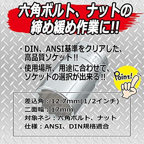「SK11 ソケット 12角 S4-17 二面幅:17×差込角:12.7mm 1個」▼4977292851183▼(商品説明)差込角12.7・ 17mm S4-17・・Size:17mmStyle:差込角12.7・特徴:使用場所、用途に合わせてソケットの選択ができる・差込角:12.7mm(1/2インチ)・二面幅:17mm・対象ネジ:六角ボルト、ナット・仕様:ANSI、DIN規格適合説明 商品紹介 DIN、ANSI基準をクリアした高品質ソケット 【用途】 六角ボルト、ナットの締め緩め作業 【特徴】 ・使用場所、用途に合わせてソケットの選択ができる 【注意事項】 ※ボルト、ナットはサイズに合ったものをご使用下さい。 ※ソケットはボルト、ナットに対して斜め掛けや浅掛けをしないよう、奥まで完全に差し込んでご使用下さい。 より ●海外の厳しい基準のANSI、DIN規格をクリアした品質