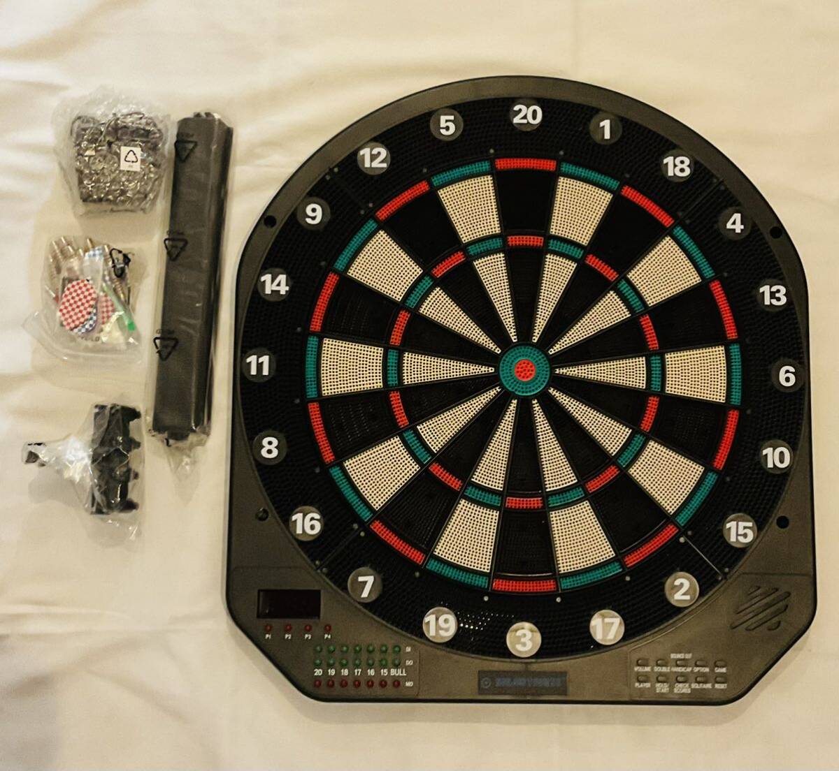 箱は劣化していますが、中身は未使用品です。ダーツのセットが入っています。説明書も付いています。大きさがかなり大きいので送料が高くなりますが、本格的なダーツゲームが楽しみますのでよろしくお願いいたします。ただし袋は開けていないのでテスト起動などは行っておりませんのであらかじめご了承ください。