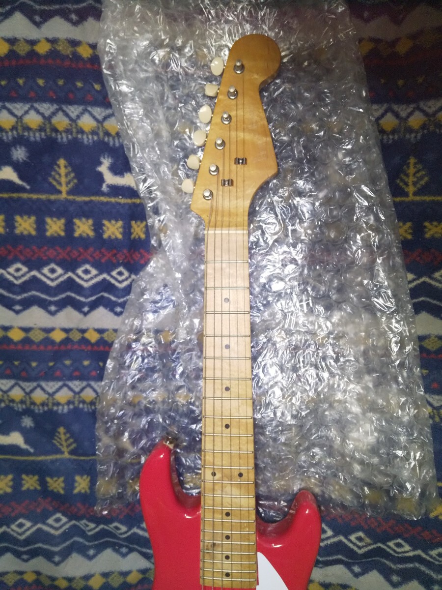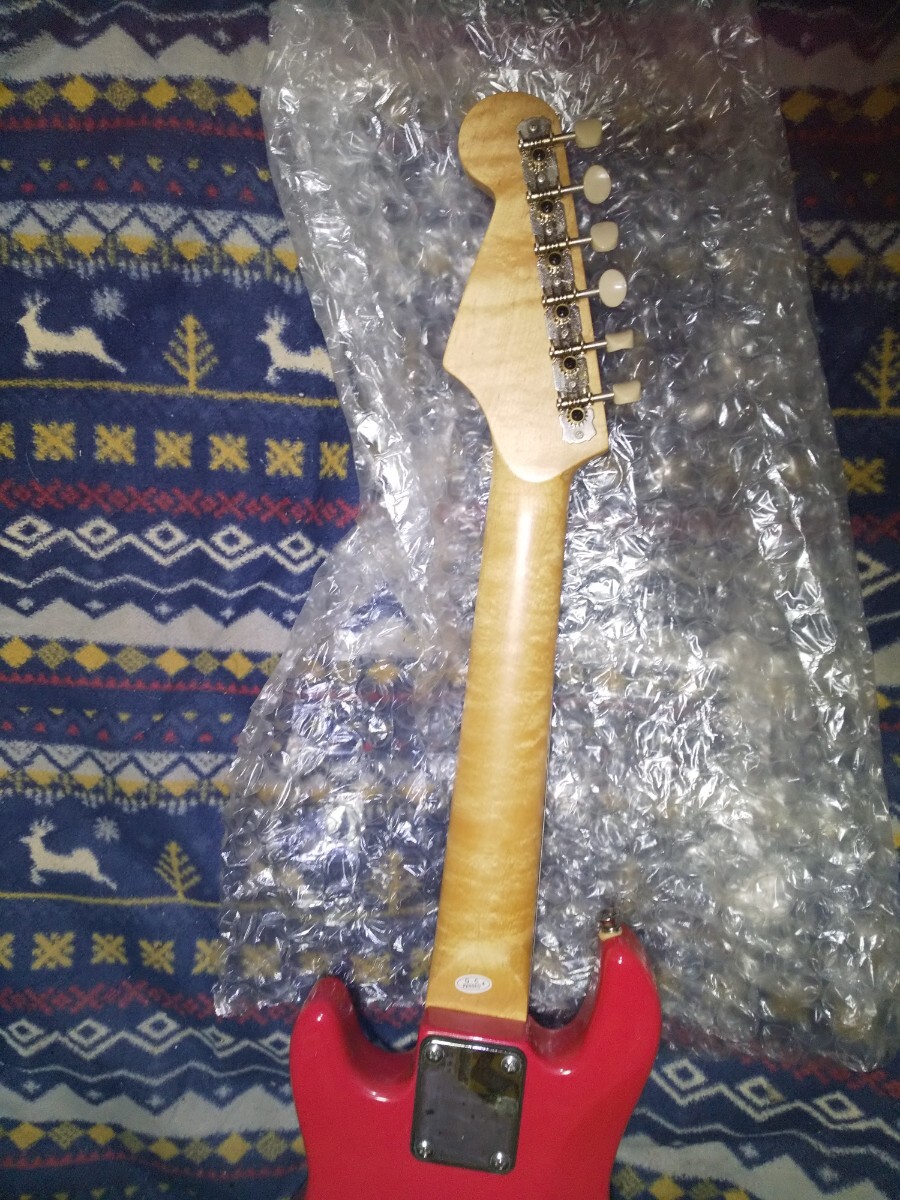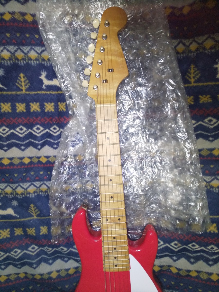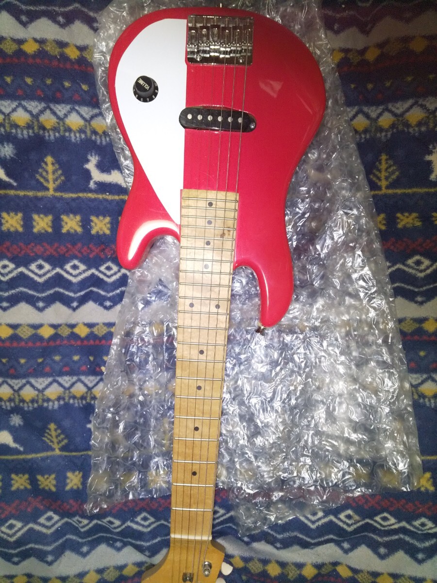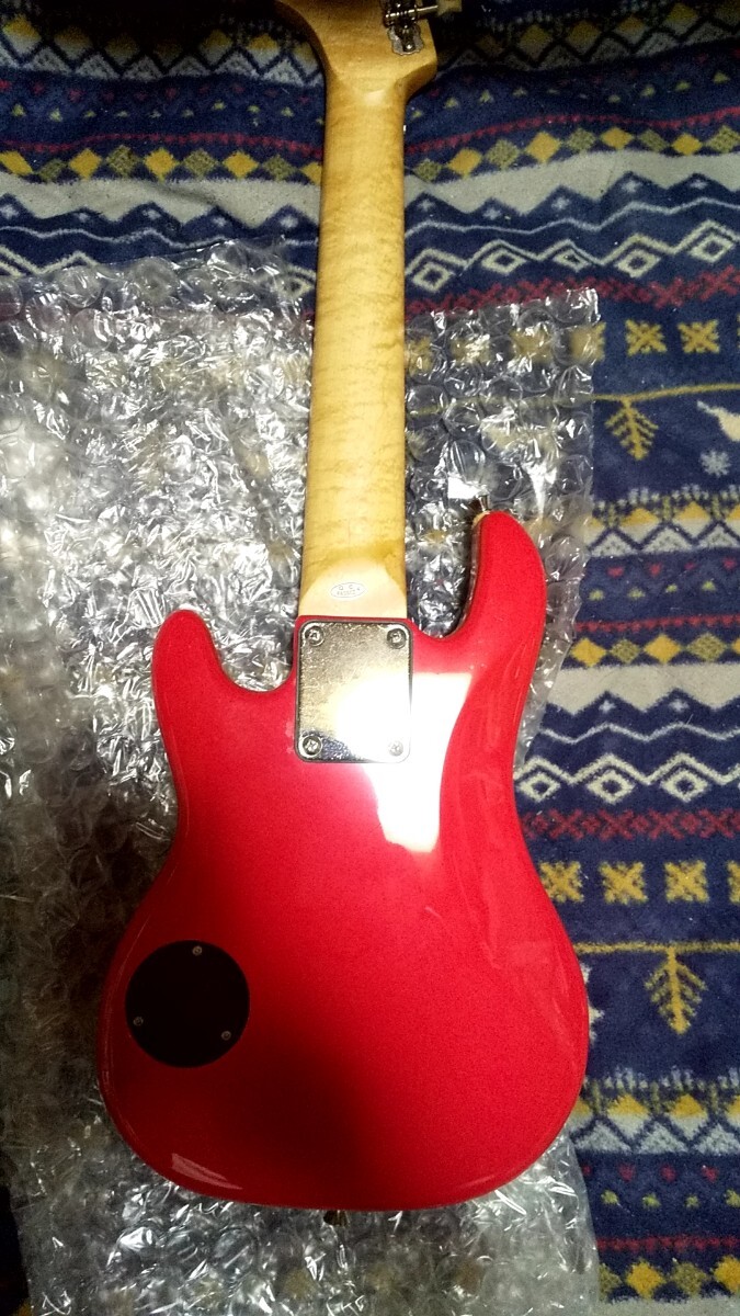 ピンクカラー(画像では赤に見えてます)で可愛い感じですが、リッケンタイプのピックガード付きで男性が持ってもなかなかいい感じです、あまり見かけないと思います