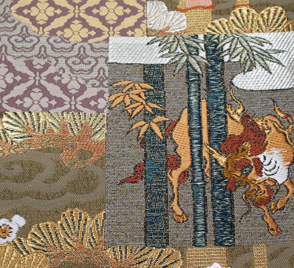 | 誉田屋源兵衛 西陣織袋帯 金・緑地 唐織・牛・松竹梅・花菱文 仕立て上がり | |