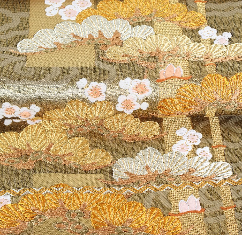 | 色・柄 | 誉田屋源兵衛 西陣織袋帯 金・緑地 唐織・牛・松竹梅・花菱文 (写真では上手く色が出ない場合があります。ご了承下さい) ※お使いのディスプレイの種類や設定の差により 実物の色と画像の色が少々異なることもございます。 写真の枚数が多いので一度パソコンでご覧ください。 |