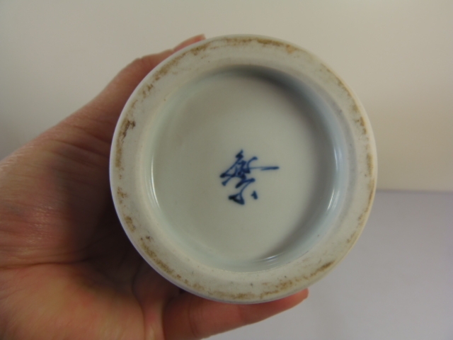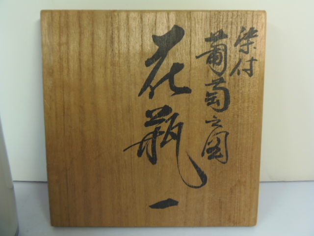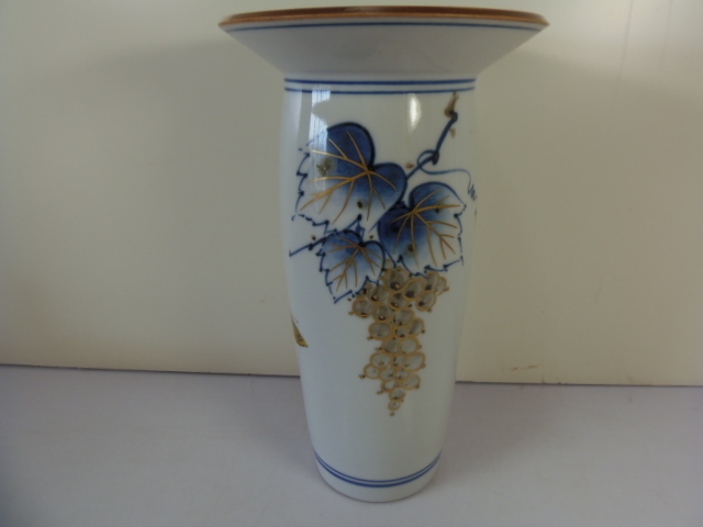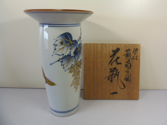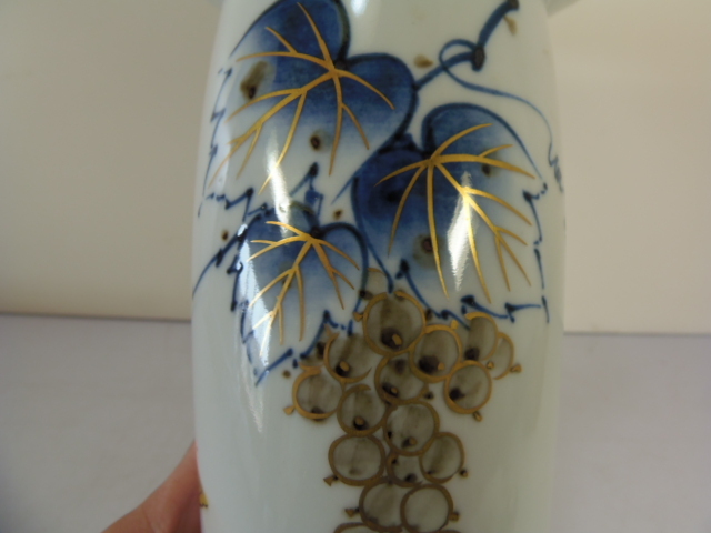 k272 【九谷焼 藤原繁雄】 花瓶 染付 葡萄と蝶文様 【同梱不可】