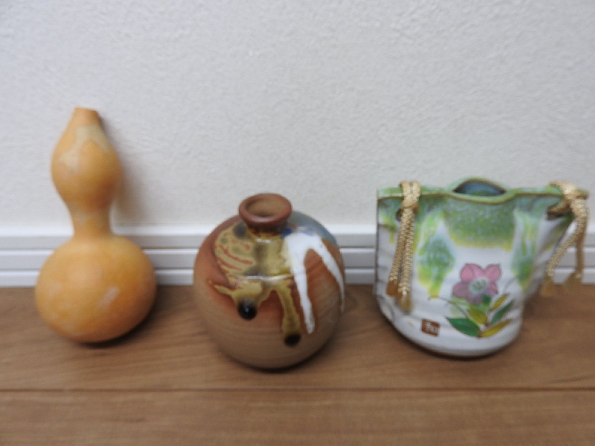茶道具 華道具 花入 一輪挿し 花器 瓢箪 陶器 3点 になります。 比較的綺麗な状態かと思いますが、やや変色ございます。 【サイズ】 瓢箪 全長 11.5㎝ 壺 花器 口径 2㎝ 幅 7㎝ 高さ 8.5㎝ 花模様 花器 幅 8.5㎝ 奥行 6㎝ 高さ 8.5㎝ 写っているものが全てです。 状態も含めて写真にてご確認下さい。 | ||||