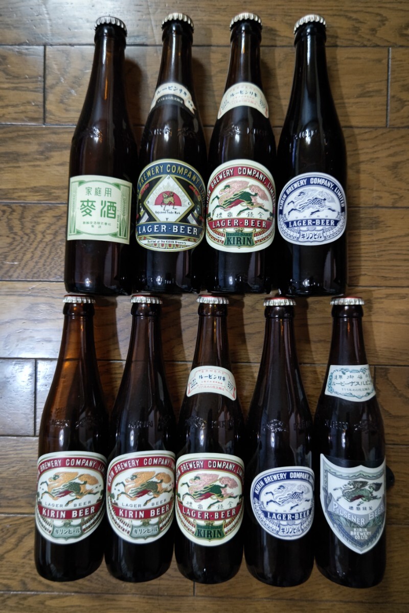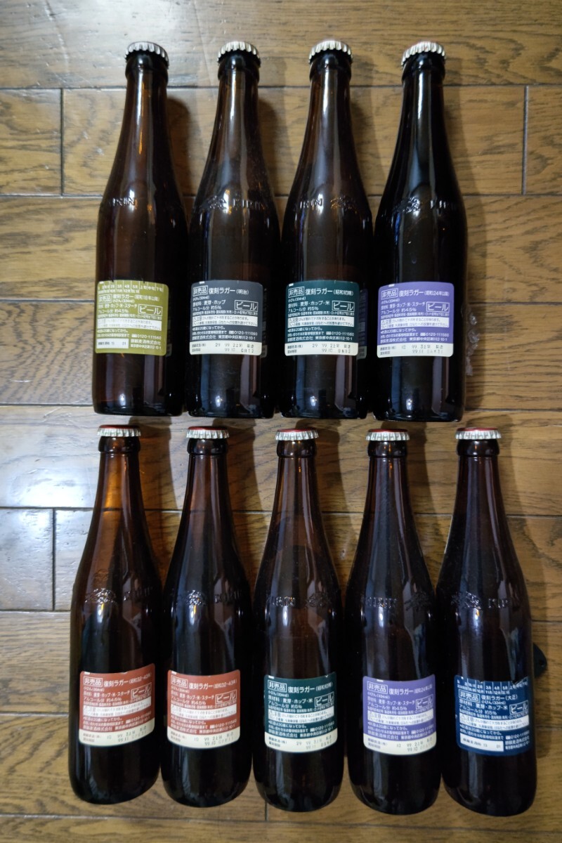 ビール瓶9本中8本は空瓶ですが、1本は未開封品になります。コレクションの為開封せず保管していました。