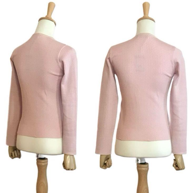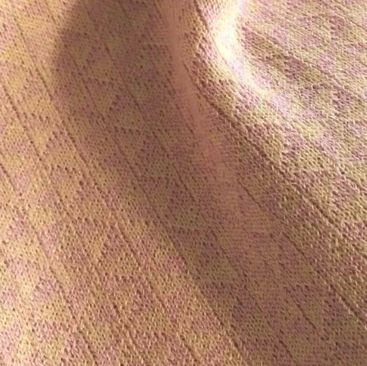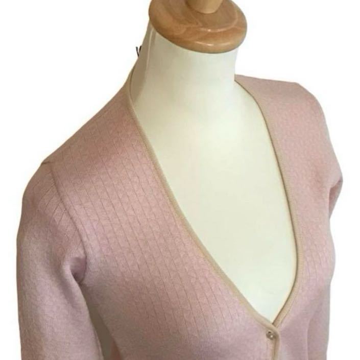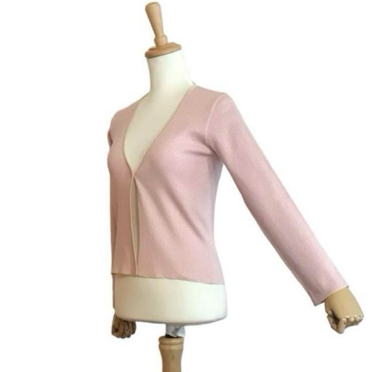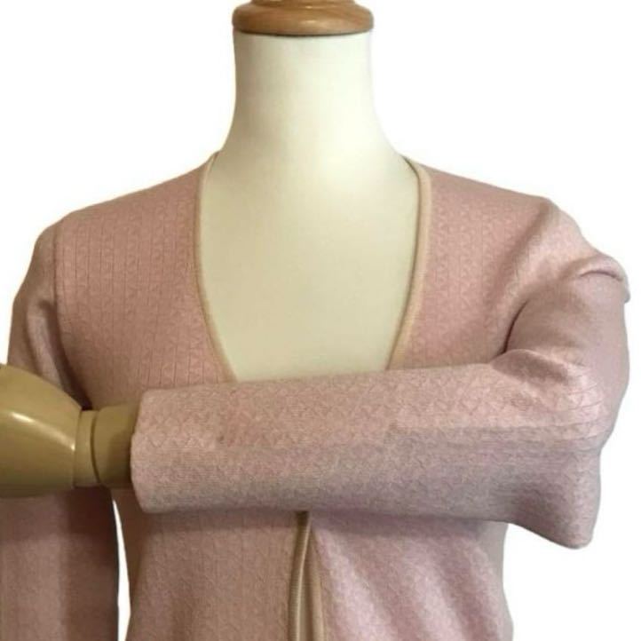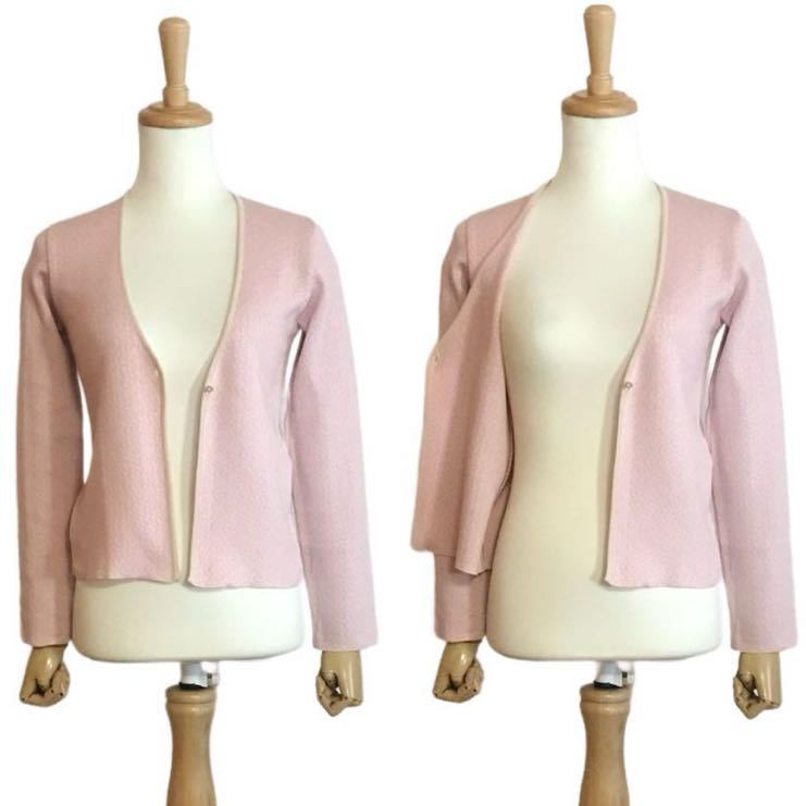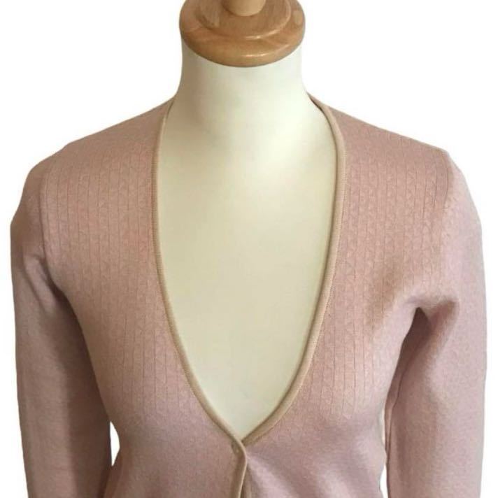 優しい色合いのジャガード織りニット。フロントボタンは1つ。さっと羽織やすいカーディガンです。
