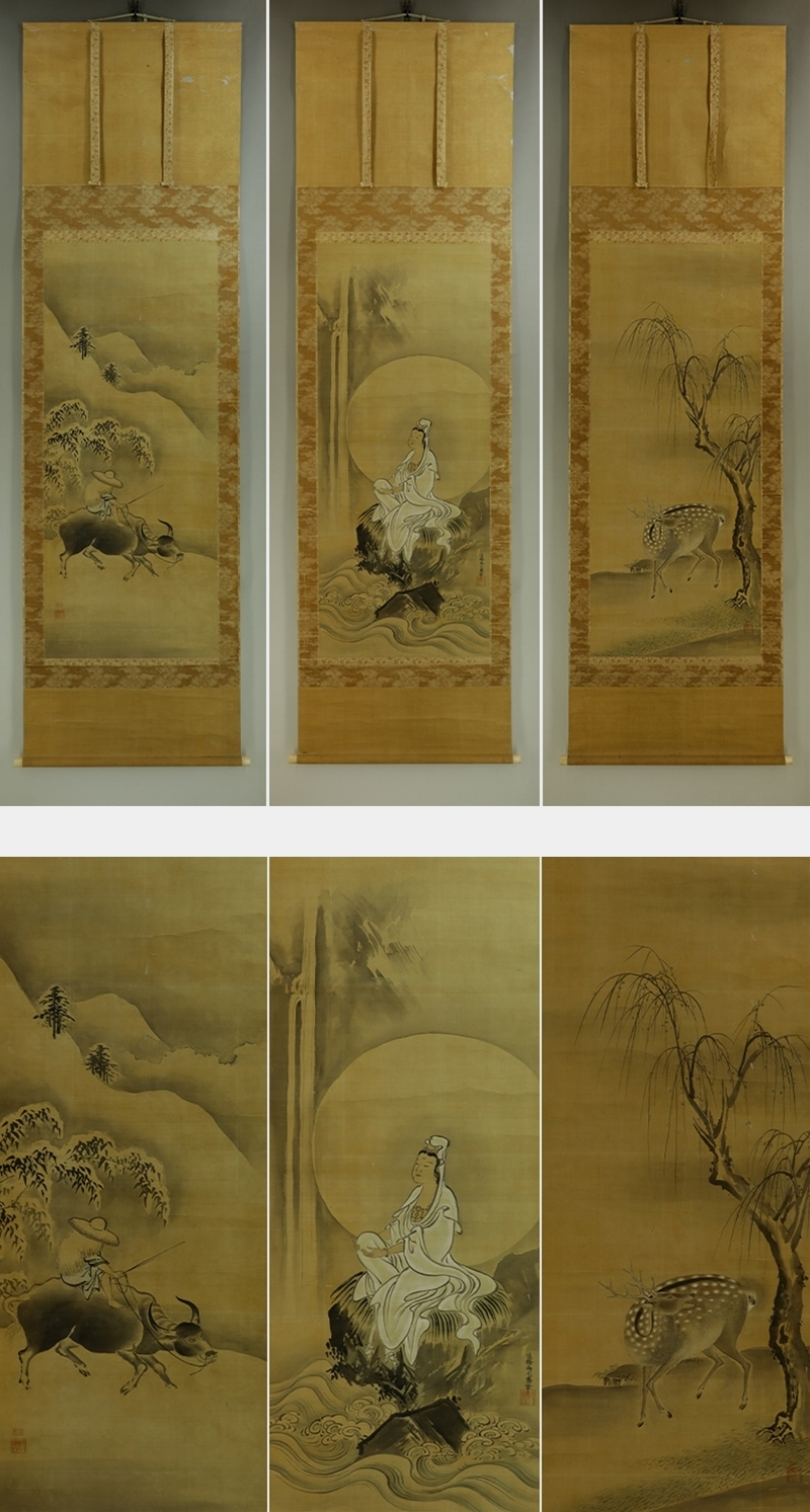 | №2306076 希少【模写】桑原幽宅【三対幅・瀧見観音】◆絹本◆合箱◆掛軸 | |